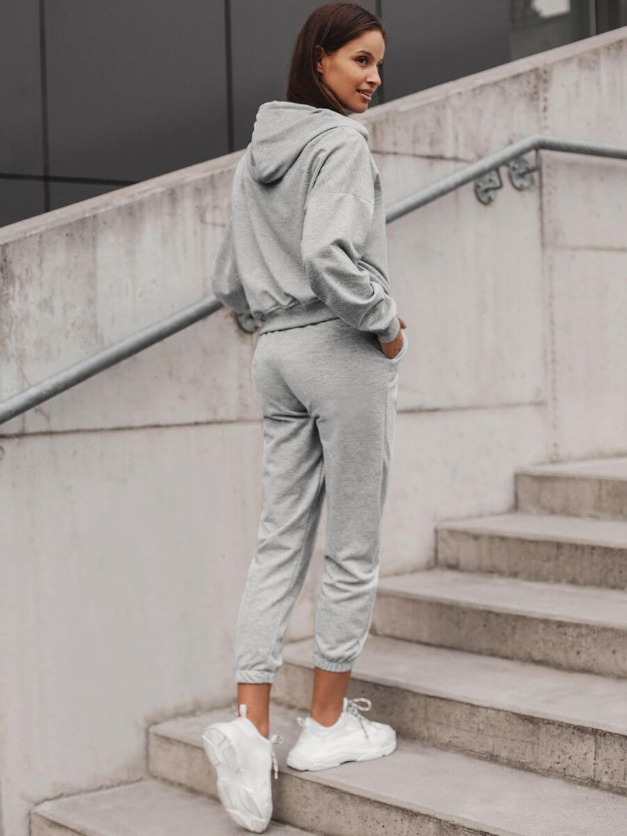 W skład kompletu wchodzą 2 elementy. Jednym z nich jest wkładana przez głowę bluza z praktycznym kapturem, który bardzo dobrze sprawdza się w chłodne, wietrzne dni. Zestaw zawiera również spodnie z kieszeniami po bokach, do których można schować niezbędne drobiazgi, takie jak klucze, telefon czy portfel. Komplet został wykonany z połączenia bawełny, poliestru oraz elastanu. Sprawia to, że ładnie dopasowuje się do sylwetki, jest wygodny w noszeniu i przyjemny w dotyku.