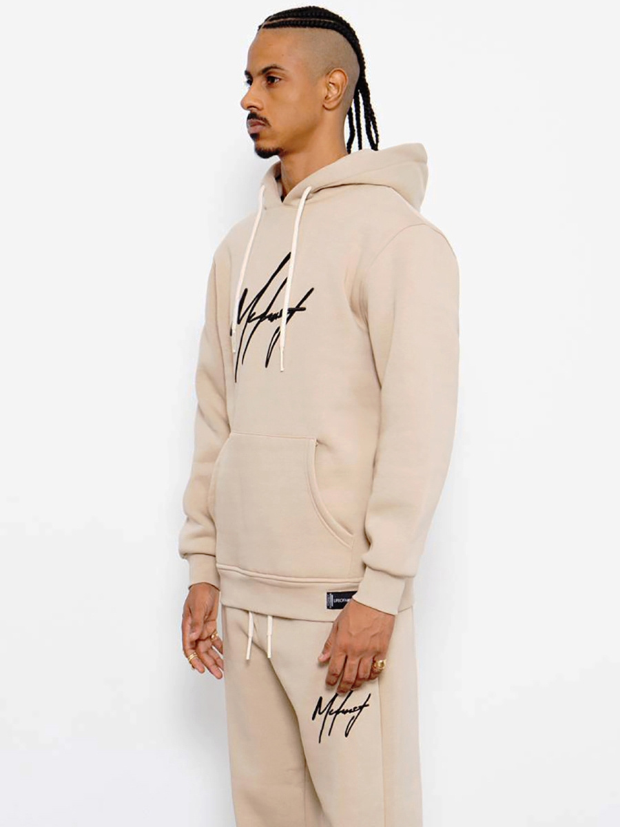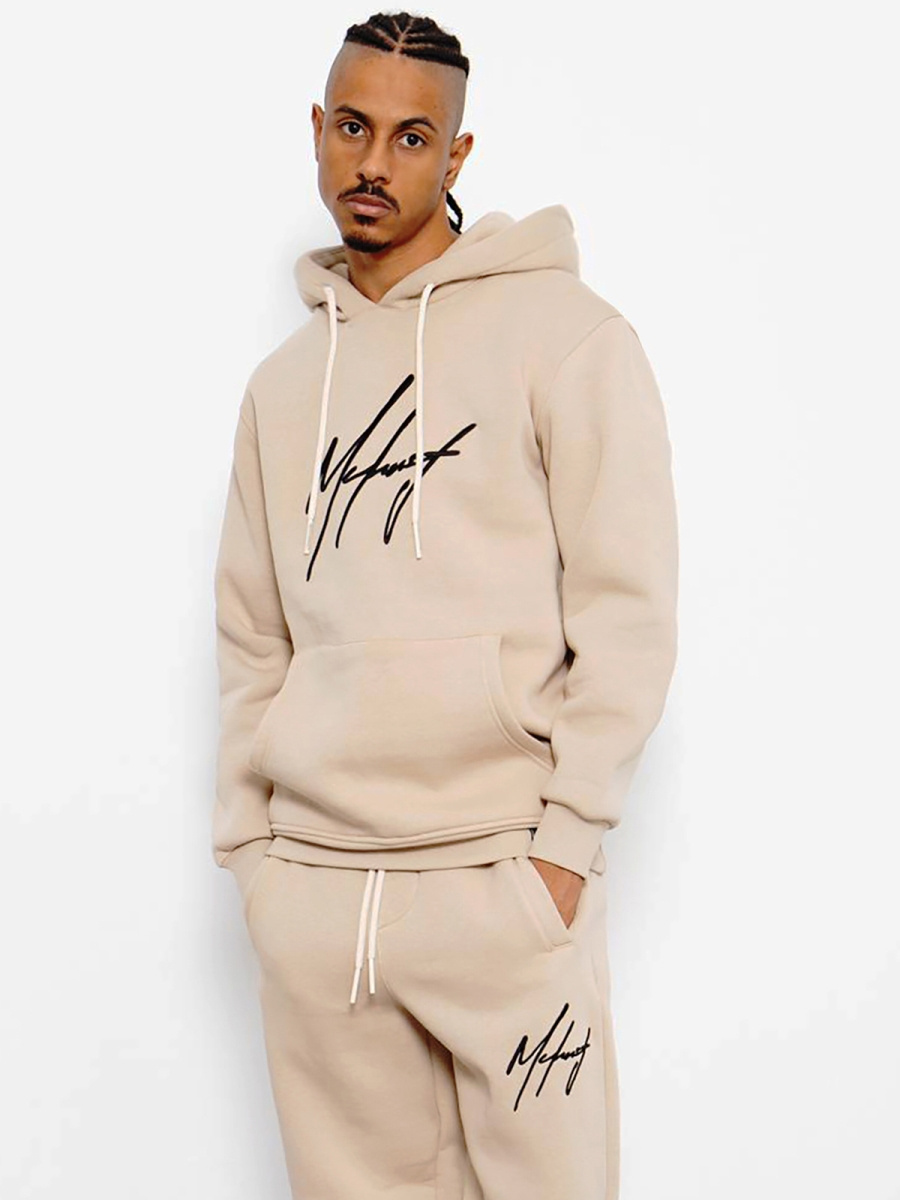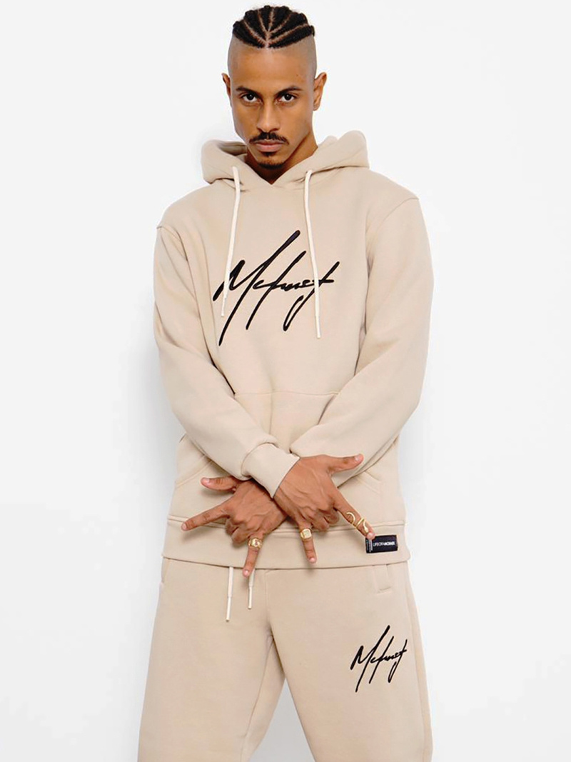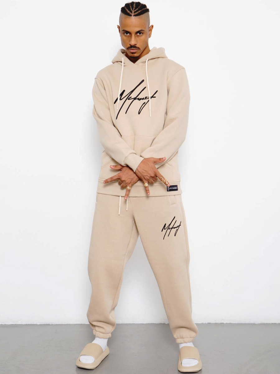 Zestaw męski ma oversize’owy fason. Składa się on ze spodni z kieszeniami po bokach i z tyłu, do których można schować niezbędne drobiazgi oraz bluzy z kieszenią typu kangurka oraz praktycznym kapturem, który skutecznie chroni przed zimnem i wiatrem. Komplet został wykonany z połączenia bawełny oraz poliestru, dzięki czemu ładnie dopasowuje się do sylwetki, jest wygodny w noszeniu i przyjemny w dotyku.