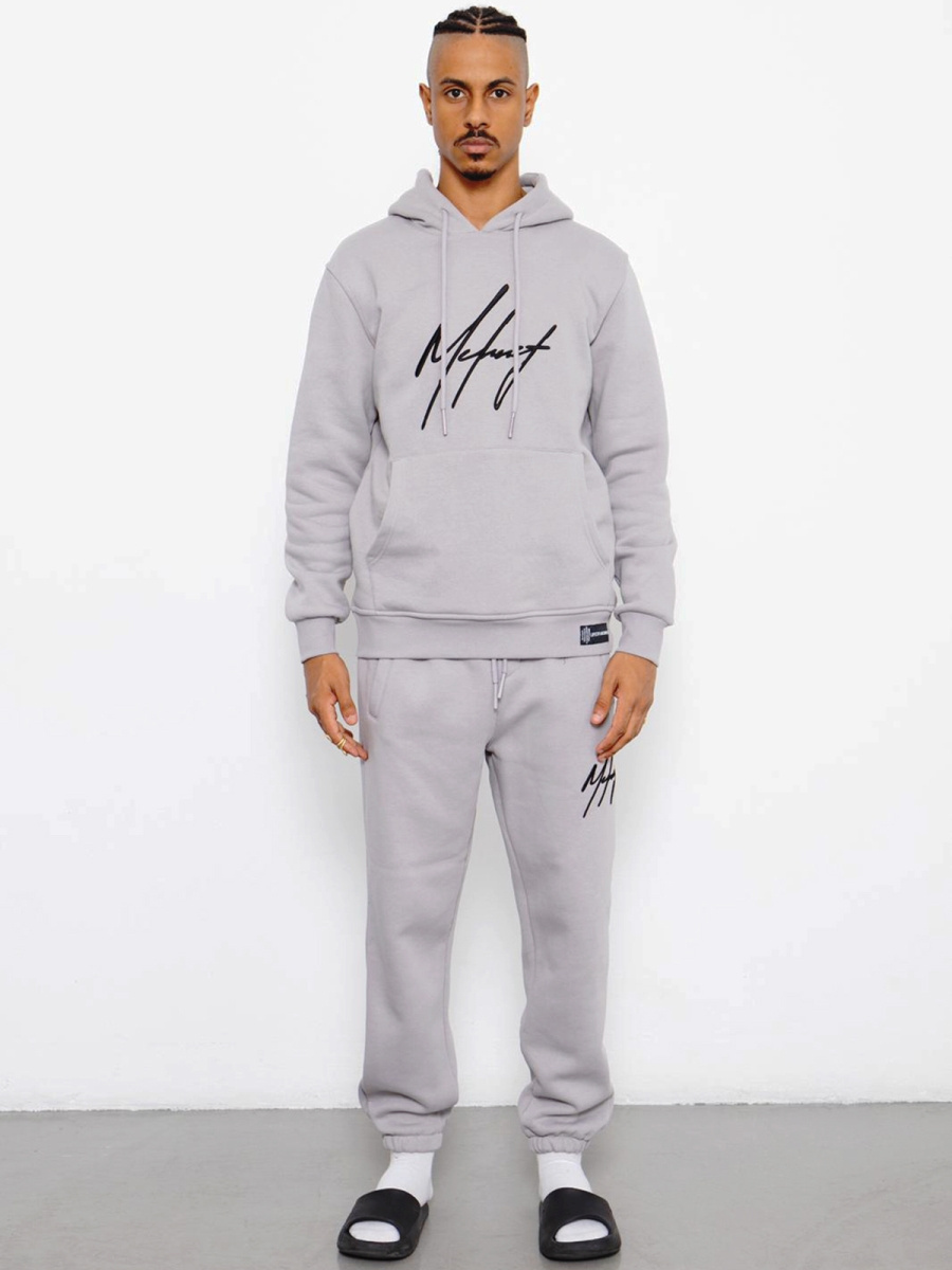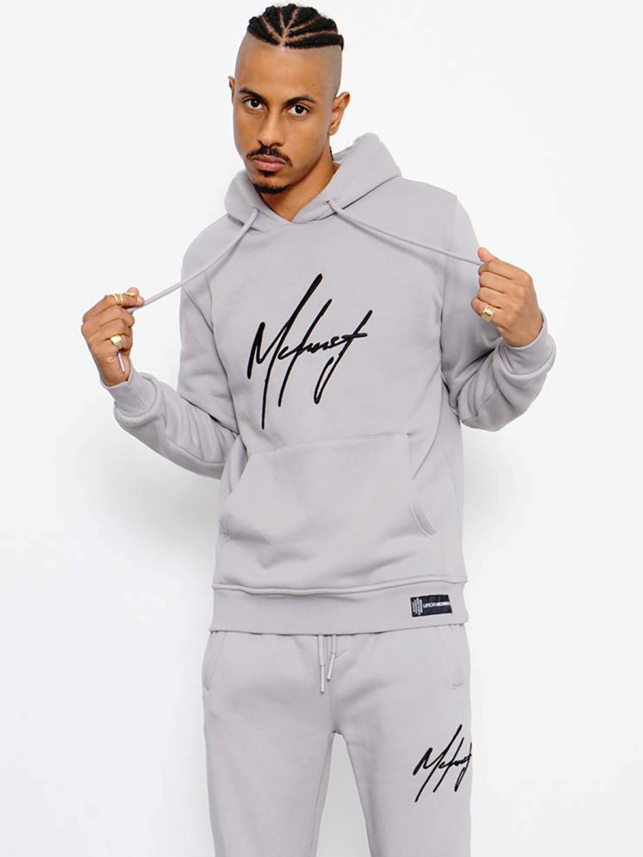 Zestaw męski ma oversize’owy fason. Składa się on ze spodni z kieszeniami po bokach i z tyłu, do których można schować niezbędne drobiazgi oraz bluzy z kieszenią typu kangurka oraz praktycznym kapturem, który skutecznie chroni przed zimnem i wiatrem. Komplet został wykonany z połączenia bawełny oraz poliestru, dzięki czemu ładnie dopasowuje się do sylwetki, jest wygodny w noszeniu i przyjemny w dotyku.