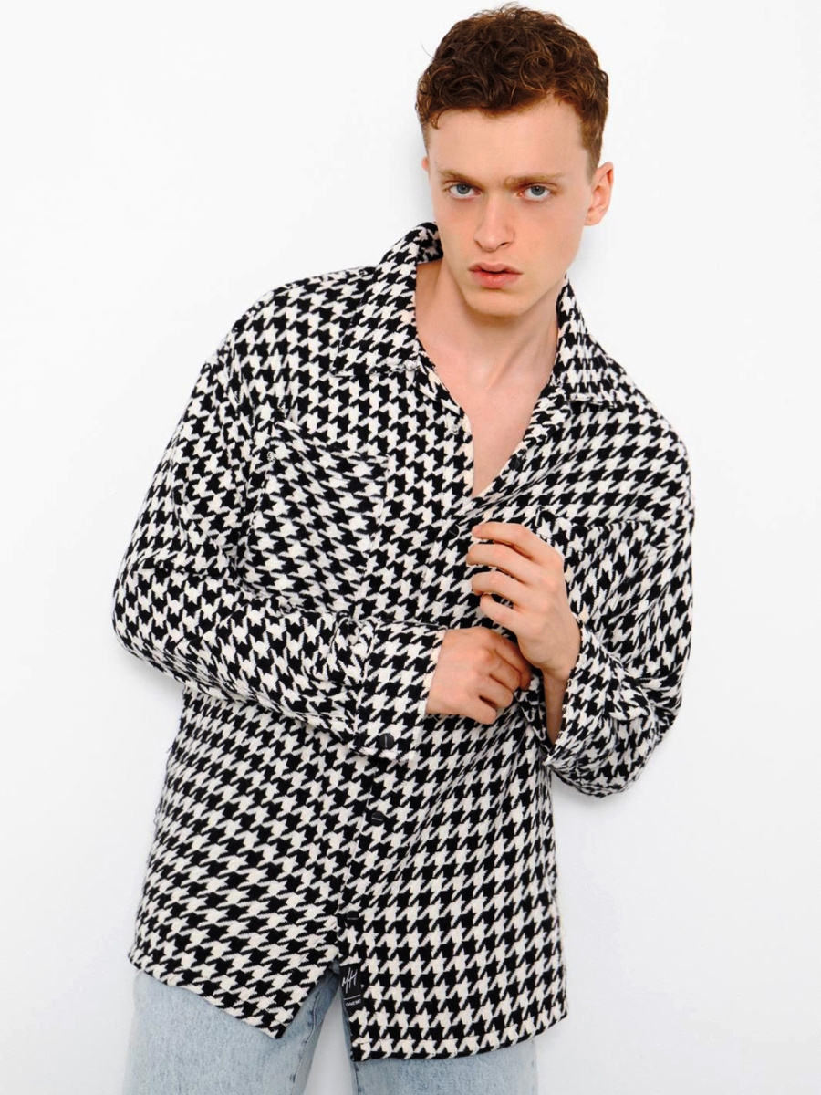 Koszula ma długi rękaw, kołnierzyk typu kent i zapięcie na zatrzaski. Na przodzie znajdują się 2 kieszenie. Koszulę pokrywa wzór w czarno — białą kratę. Została ona wykonana w całości z wysokiej jakości bawełny. Sprawia to, że jest bardzo wygodna w noszeniu, przyjemna w dotyku, przewiewna i odporna na uszkodzenia oraz zagniecenia.