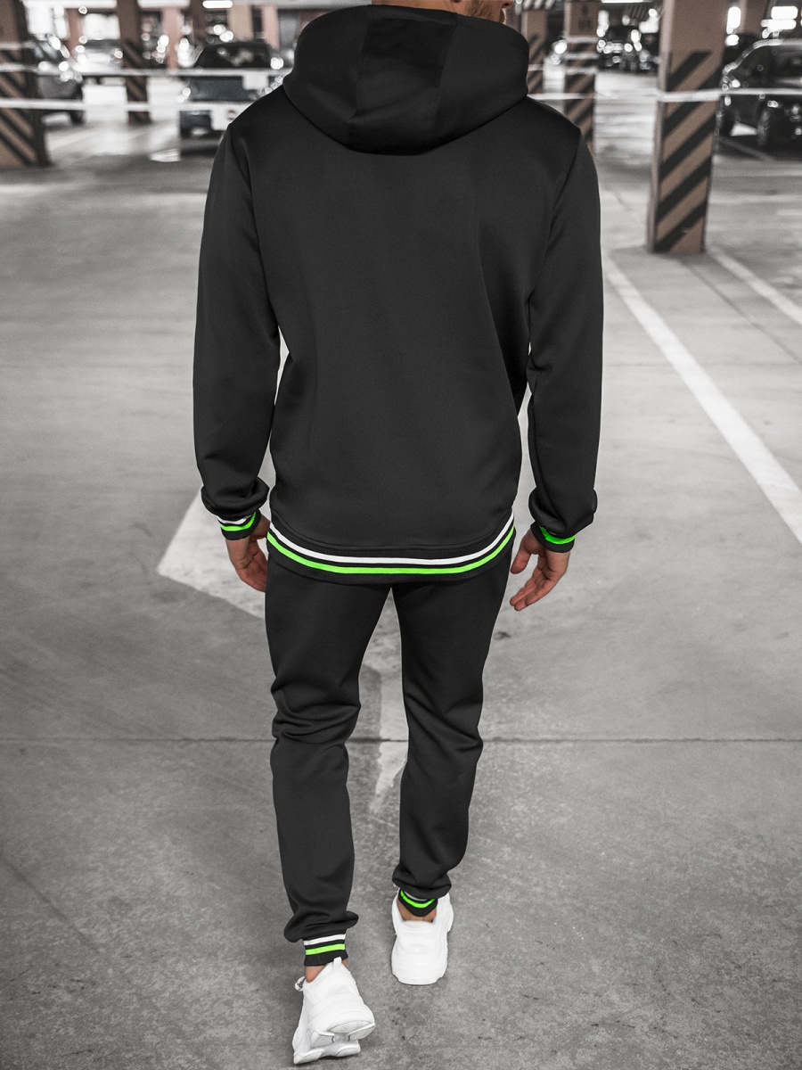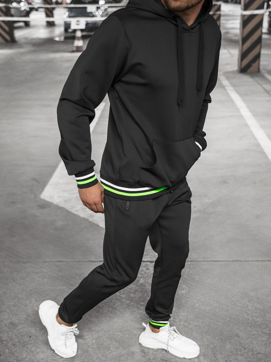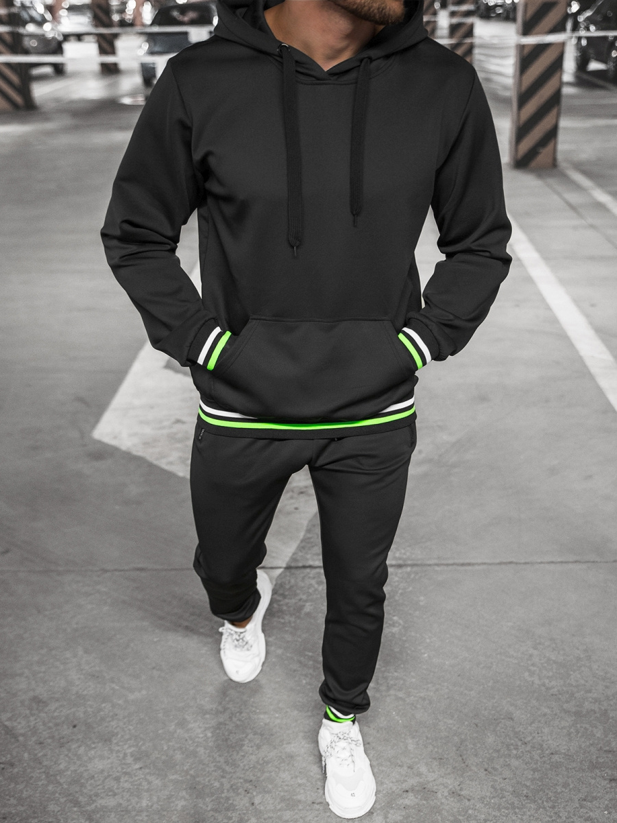 Zestaw męski składa się z 2 elementów. Jednym z nich jest bluza z kapturem z kieszenią typu kangurka wykończona ściągaczami, drugim — spodnie z kieszeniami na zamek błyskawiczny ze ściągaczami. Komplet został wykonany z połączenia bawełny oraz poliestru, co sprawia, że jest wygodny w noszeniu, przyjemny w dotyku i ładnie dopasowuje się do sylwetki.
