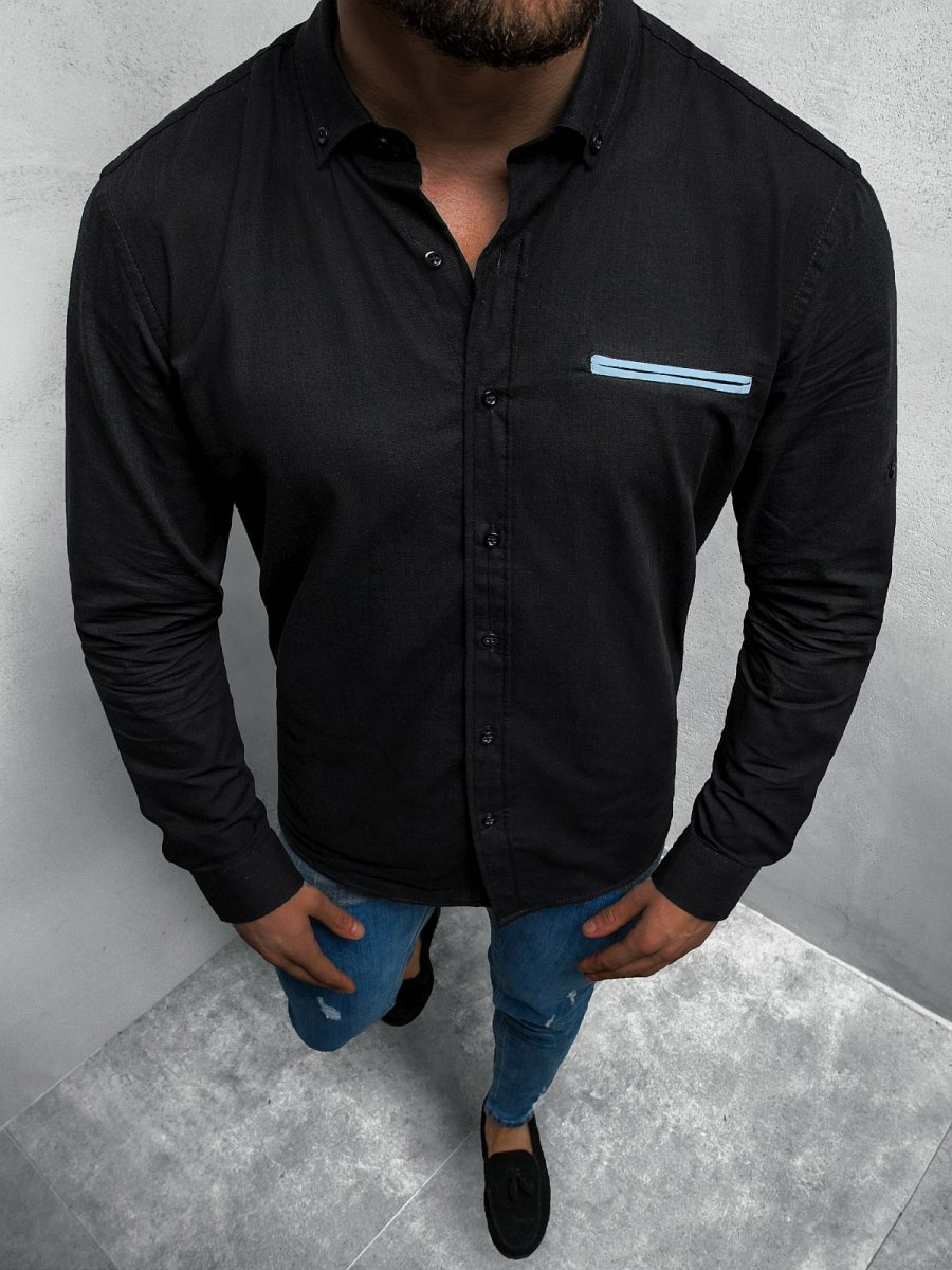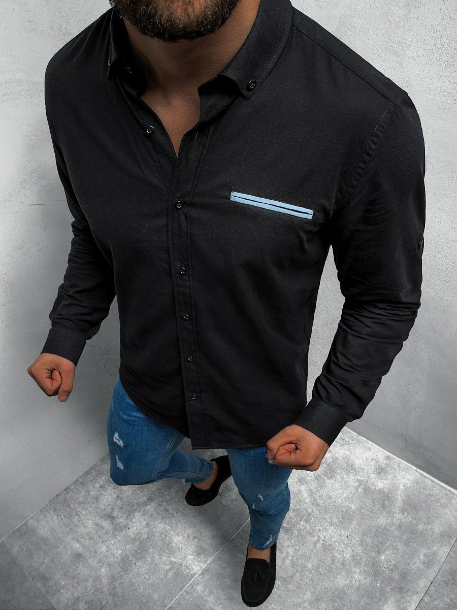 Koszula pochodzi z najnowszej kolekcji. Posiada długi rękaw, zapięcie na guziki i kołnierzyk typu kent. Oryginalnego wyglądu nadaje jej kontrastowa wstawka imitująca kieszeń. Koszula została wykonana w całości z bawełny. Sprawia to, że jest wygodna w noszeniu, przewiewna, przyjemna w dotyku i odporna na uszkodzenia oraz zagniecenia.