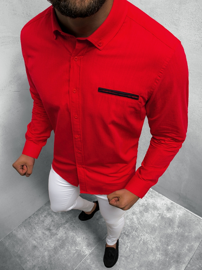 Koszula pochodzi z najnowszej kolekcji. Posiada długi rękaw, zapięcie na guziki i kołnierzyk typu kent. Oryginalnego wyglądu nadaje jej kontrastowa wstawka imitująca kieszeń. Koszula została wykonana w całości z bawełny. Sprawia to, że jest wygodna w noszeniu, przewiewna, przyjemna w dotyku i odporna na uszkodzenia oraz zagniecenia.