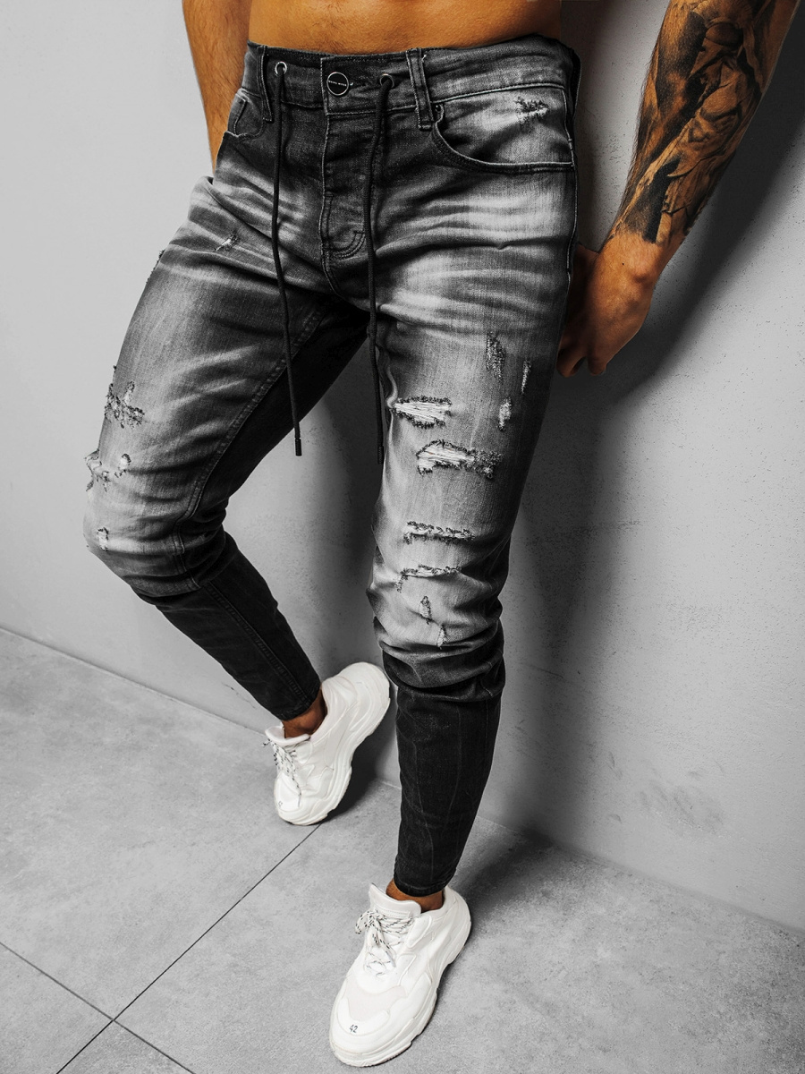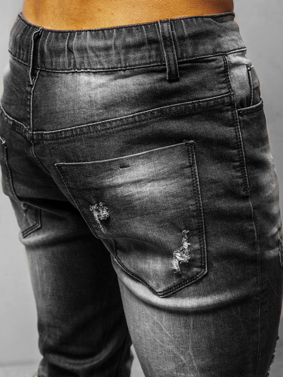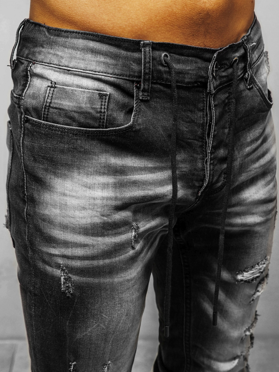 Spodnie mają fason typu slim fit, czyli z wąskimi nogawkami. Pokrywające je przetarcia nadają im oryginalnego wyglądu. Z przodu oraz z tyłu jeansów znajdują się kieszenie, do których można schować drobiazgi, takie jak klucze, portfel czy telefon. Spodnie zostały wykonane z bawełny, poliestru oraz elastanu. Sprawia to, że ładnie dopasowują się do ciała, są przyjemne w dotyku i wygodne w noszeniu.