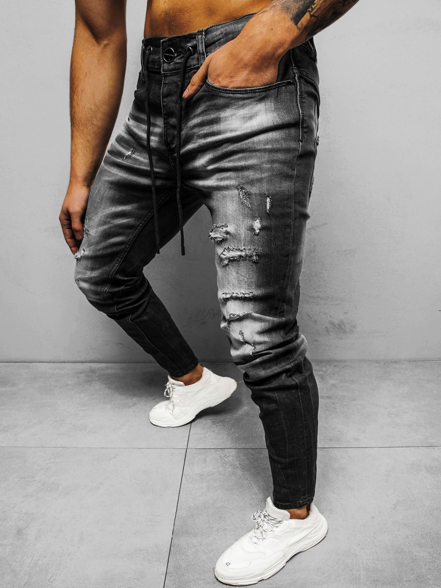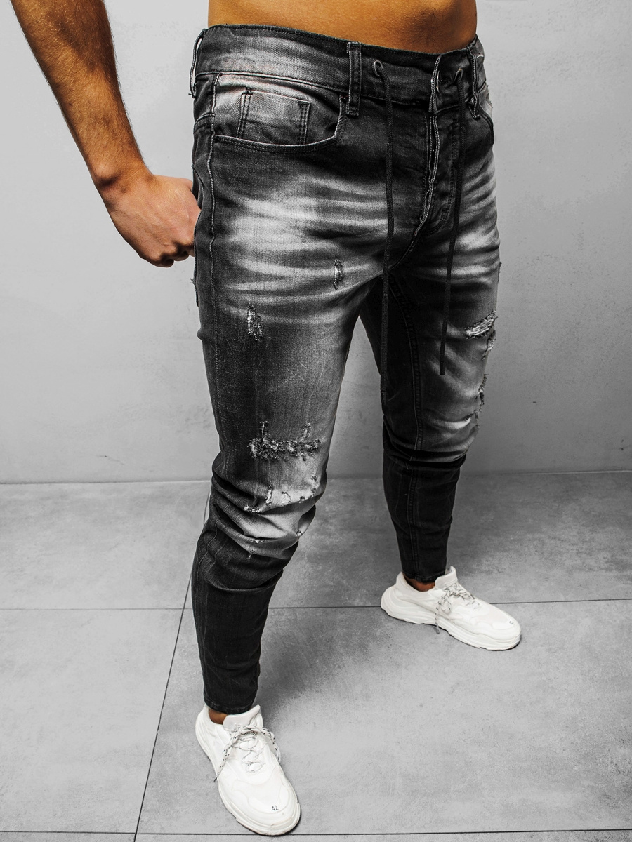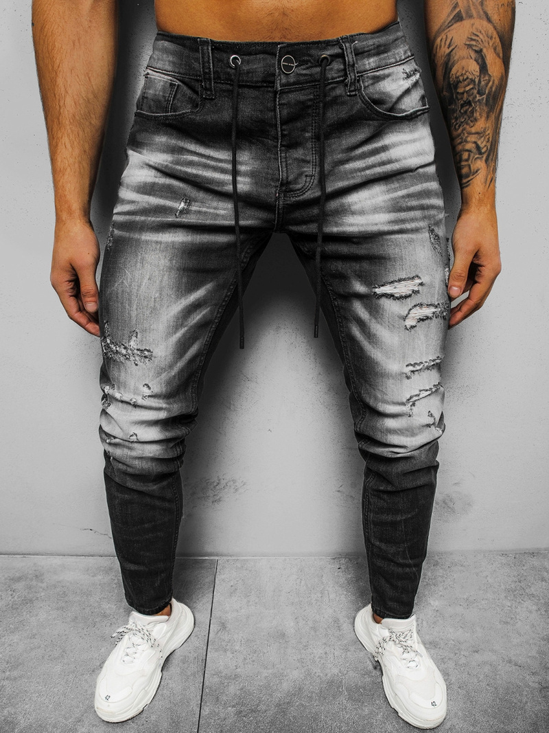 Spodnie mają fason typu slim fit, czyli z wąskimi nogawkami. Pokrywające je przetarcia nadają im oryginalnego wyglądu. Z przodu oraz z tyłu jeansów znajdują się kieszenie, do których można schować drobiazgi, takie jak klucze, portfel czy telefon. Spodnie zostały wykonane z bawełny, poliestru oraz elastanu. Sprawia to, że ładnie dopasowują się do ciała, są przyjemne w dotyku i wygodne w noszeniu.