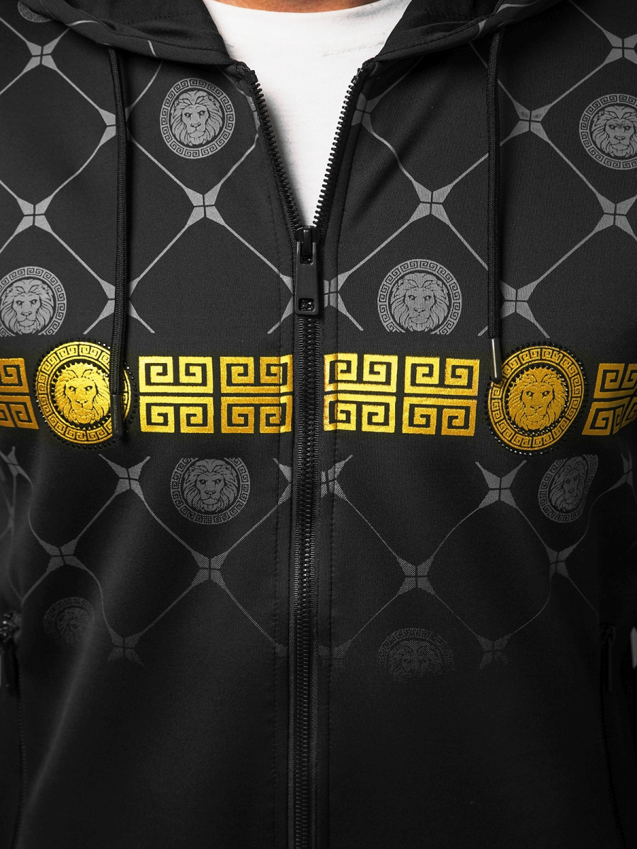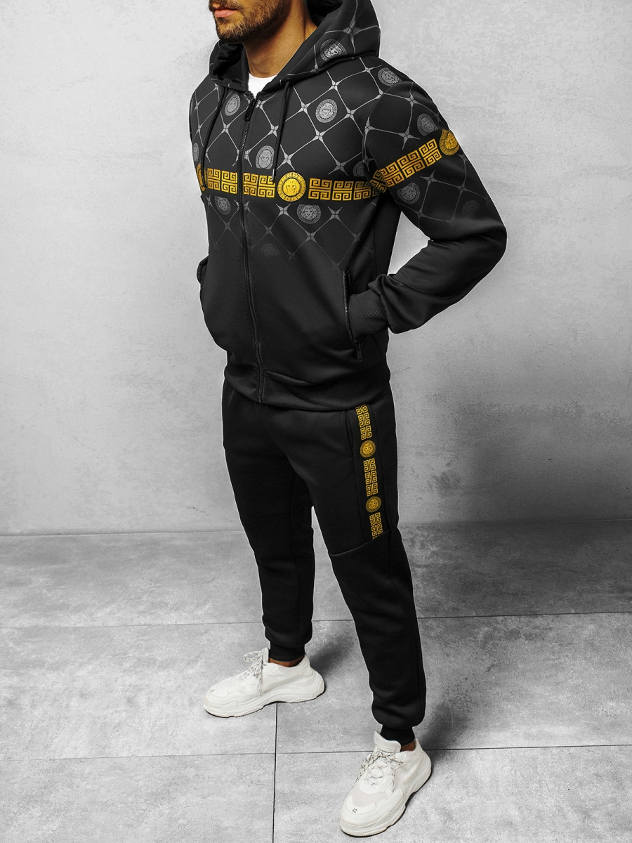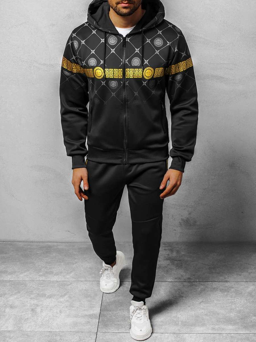 W skład kompletu męskiego wchodzą 2 elementy. Są to spodnie z kieszeniami oraz rozpinana bluza z kapturem oraz kieszeniami na zamek błyskawiczny. Zdobiący je nadruk i kontrastowe wstawki nadają im oryginalnego wyglądu. Zestaw został wykonany z połączenia bawełny oraz poliestru, dzięki czemu jest wygodny w noszeniu, przyjemny w dotyku i ładnie dopasowuje się do sylwetki.