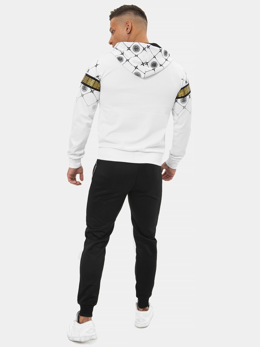W skład kompletu męskiego wchodzą 2 elementy. Są to spodnie z kieszeniami oraz rozpinana bluza z kapturem oraz kieszeniami na zamek błyskawiczny. Zdobiący je nadruk i kontrastowe wstawki nadają im oryginalnego wyglądu. Zestaw został wykonany z połączenia bawełny oraz poliestru, dzięki czemu jest wygodny w noszeniu, przyjemny w dotyku i ładnie dopasowuje się do sylwetki.