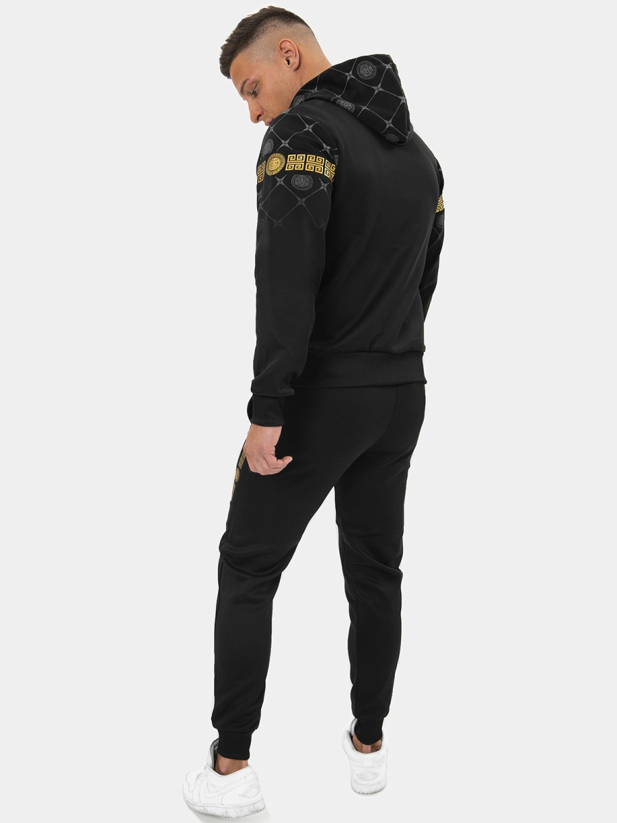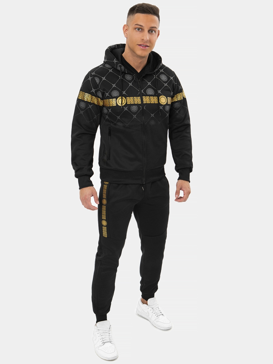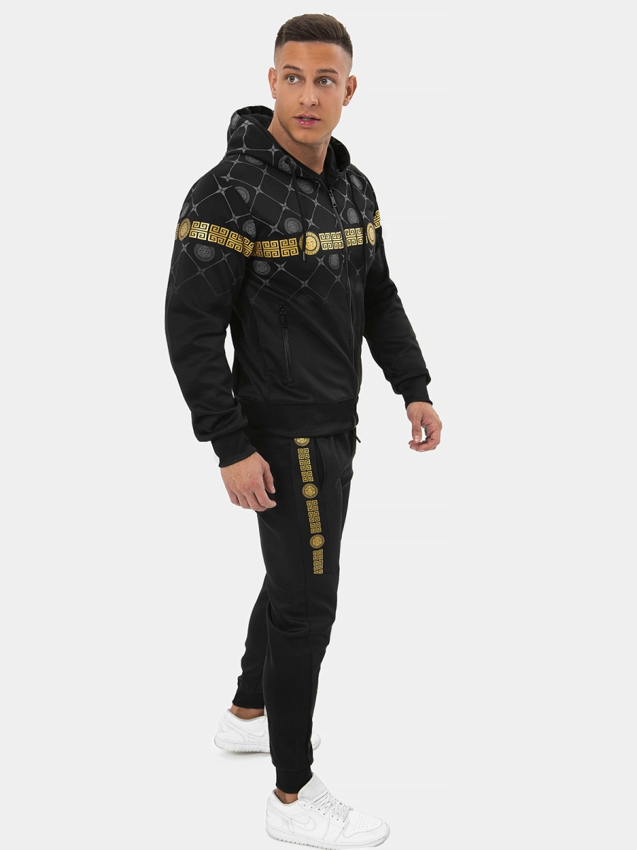 W skład kompletu męskiego wchodzą 2 elementy. Są to spodnie z kieszeniami oraz rozpinana bluza z kapturem oraz kieszeniami na zamek błyskawiczny. Zdobiący je nadruk i kontrastowe wstawki nadają im oryginalnego wyglądu. Zestaw został wykonany z połączenia bawełny oraz poliestru, dzięki czemu jest wygodny w noszeniu, przyjemny w dotyku i ładnie dopasowuje się do sylwetki.