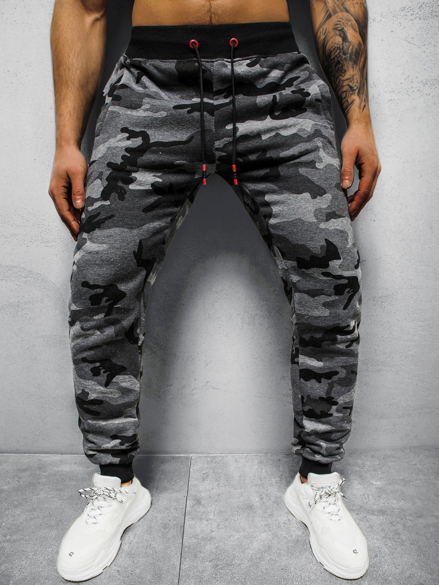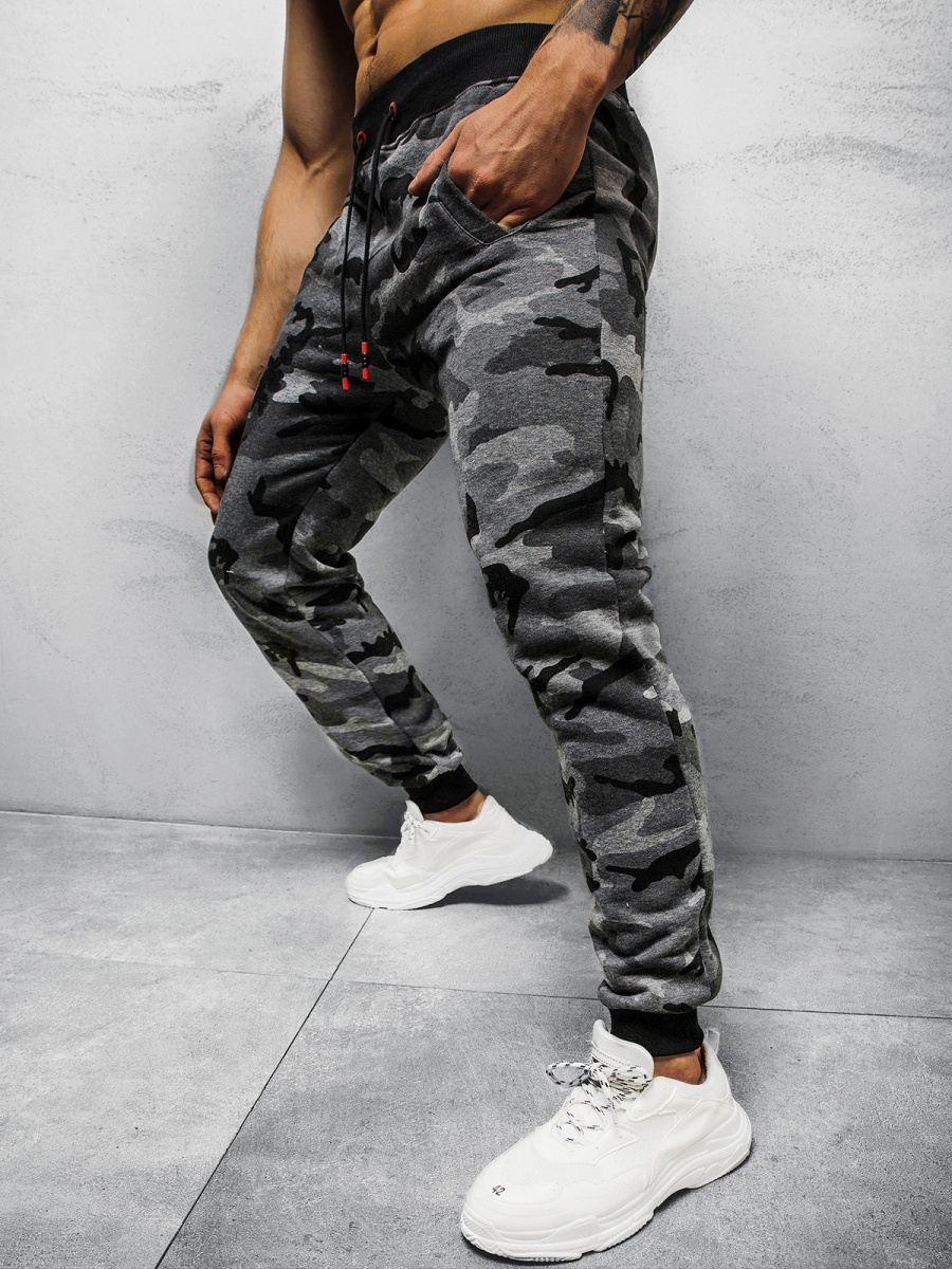 Spodnie mają fason typu joggery – posiadają obniżony krój, a ich pas oraz nogawki zostały wykończone ściągaczami. Mają również praktyczne kieszenie po bokach, do których schować możemy telefon, portfel czy klucze. Spodnie pokrywa wzór moro, który nawiązuje do mody na ubrania w stylu militarnym. Zostały one wykonane z połączenia bawełny oraz poliestru, co sprawia, że są miłe w dotyku, wygodne w noszeniu oraz przewiewne i ładnie układają się na nogawkach.
