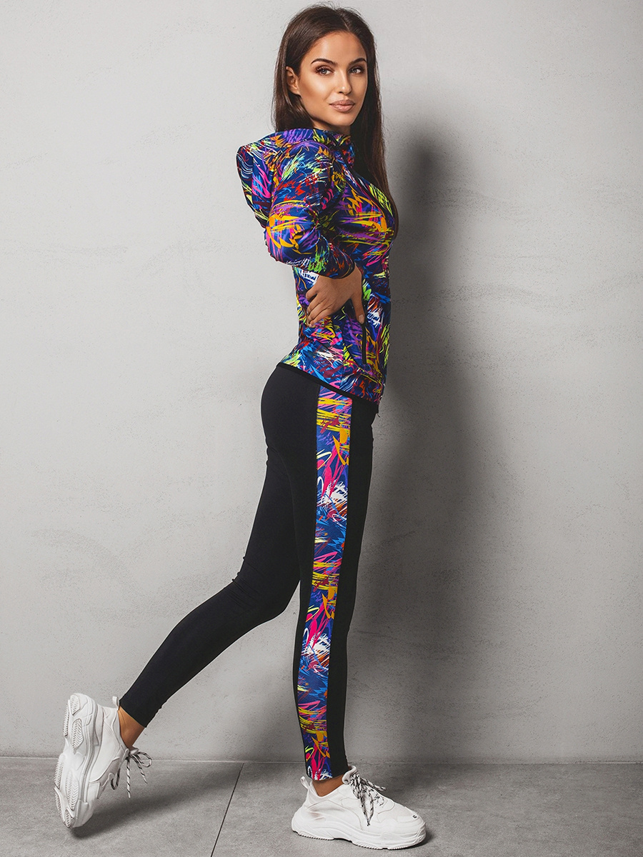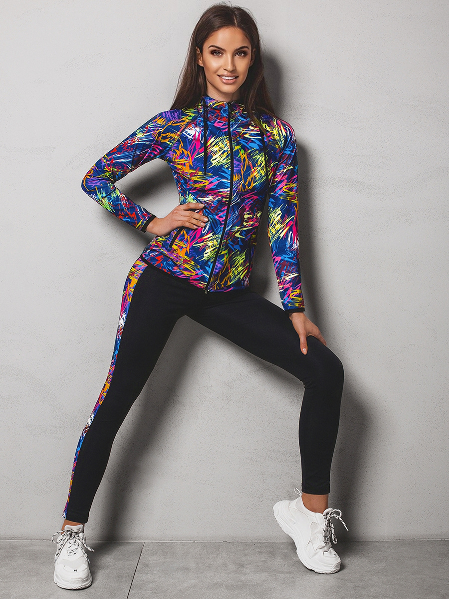 W skład kompletu wchodzą legginsy oraz rozpinana bluza z kontrastowym, designerskim wzorem, kieszeniami po bokach oraz kapturem, który doskonale sprawdzać będzie się w chłodne, wietrzne dni. Zestaw został wykonany z poliestru z domieszką elastanu, dzięki czemu ładnie dopasowuje się do ciała, nie krępuje ruchów, nie rozciąga się z czasem i szybko schnie.
