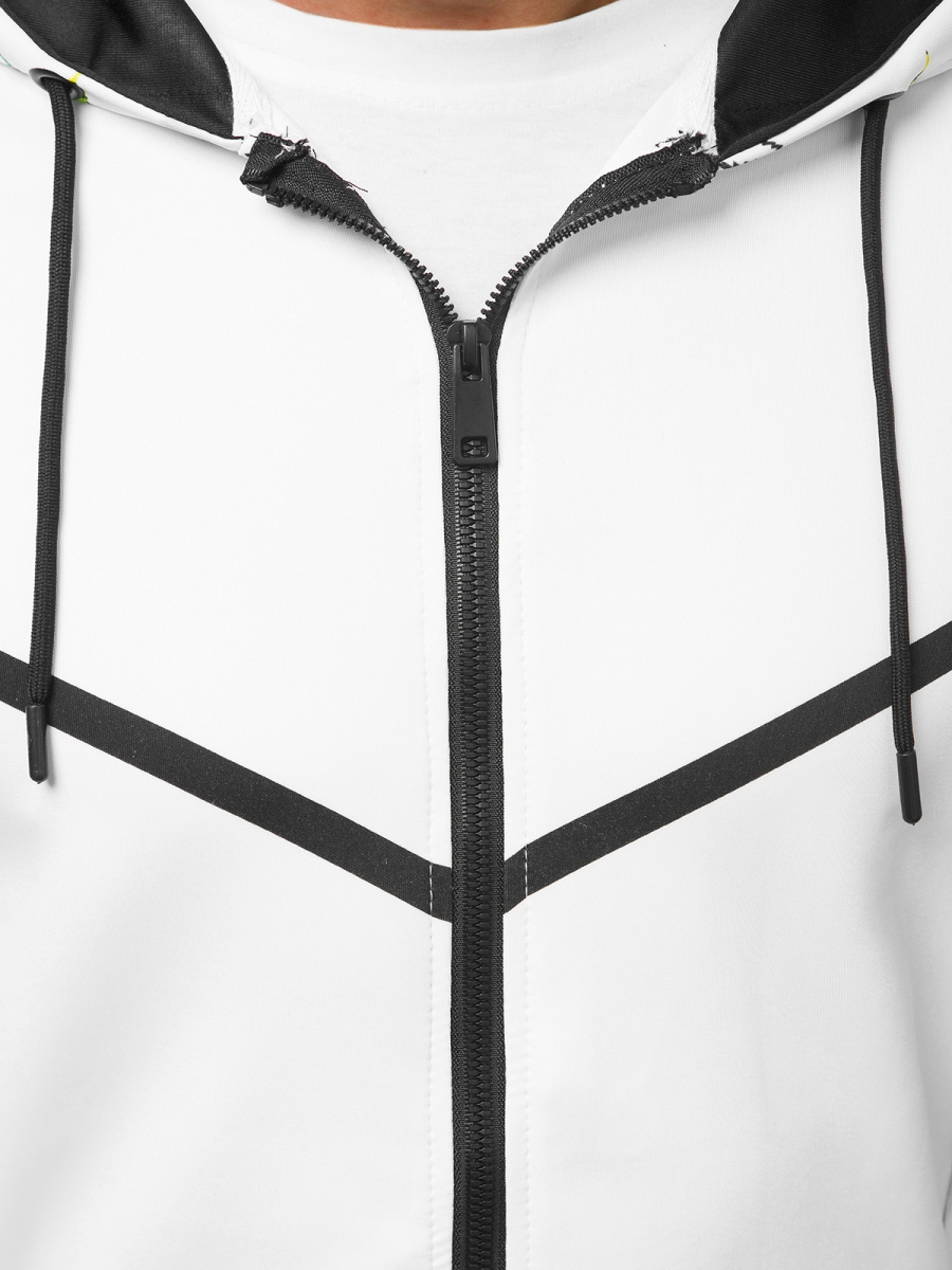 - Rozpinaną bluzę z kapturem, kieszeniami na zamek błyskawiczny, nadrukiem i kontrastowymi wstawkami