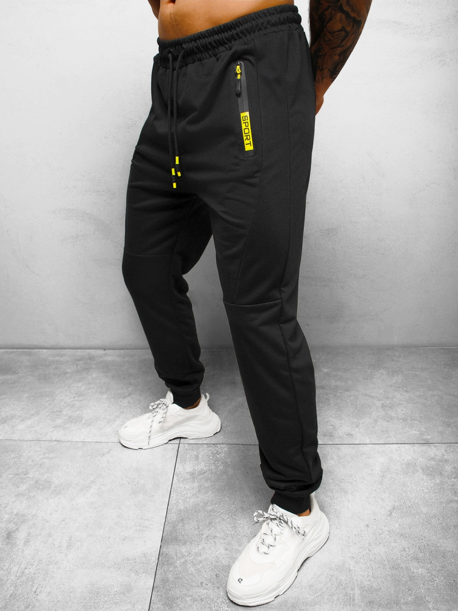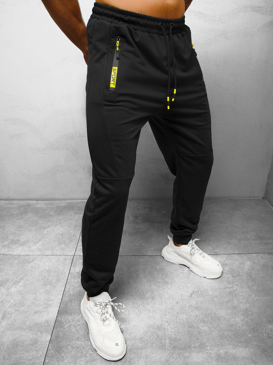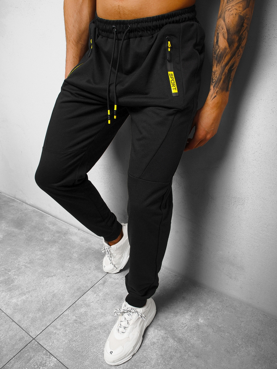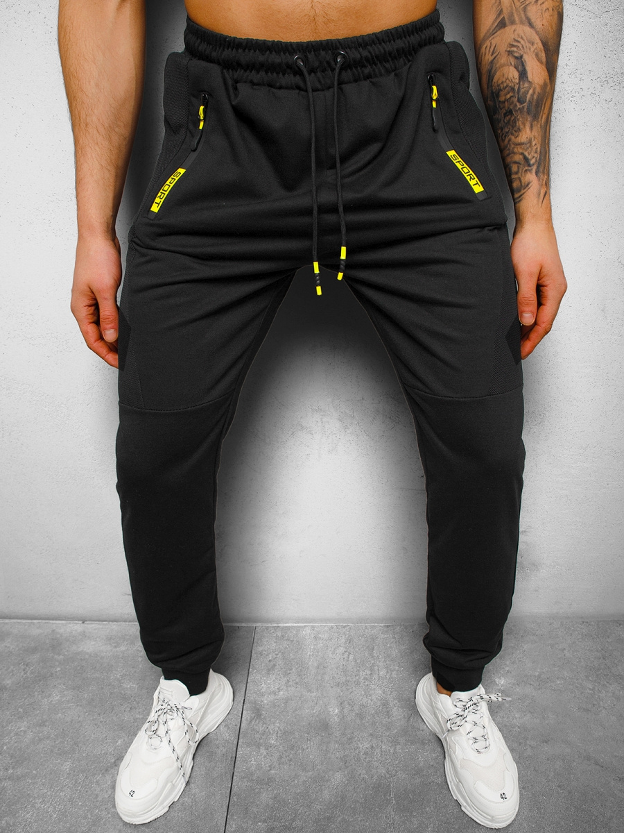 Spodnie pochodzą z najnowszej kolekcji. Mają fason typu jogger, którego cechą charakterystyczną są ściągacze w pasie i przy nogawkach. Po bokach spodni znajdują się kieszenie na zamek błyskawiczny, do których można schować drobiazgi, takie jak klucze, portfel czy telefon. Kontrastowe łączenia materiału nadają joggerom oryginalnego wyglądu. Spodnie zostały wykonane z połączenia bawełny oraz poliestru. Sprawia to, że są wygodne w noszeniu, przyjemne w dotyku i ładnie dopasowują się do sylwetki.