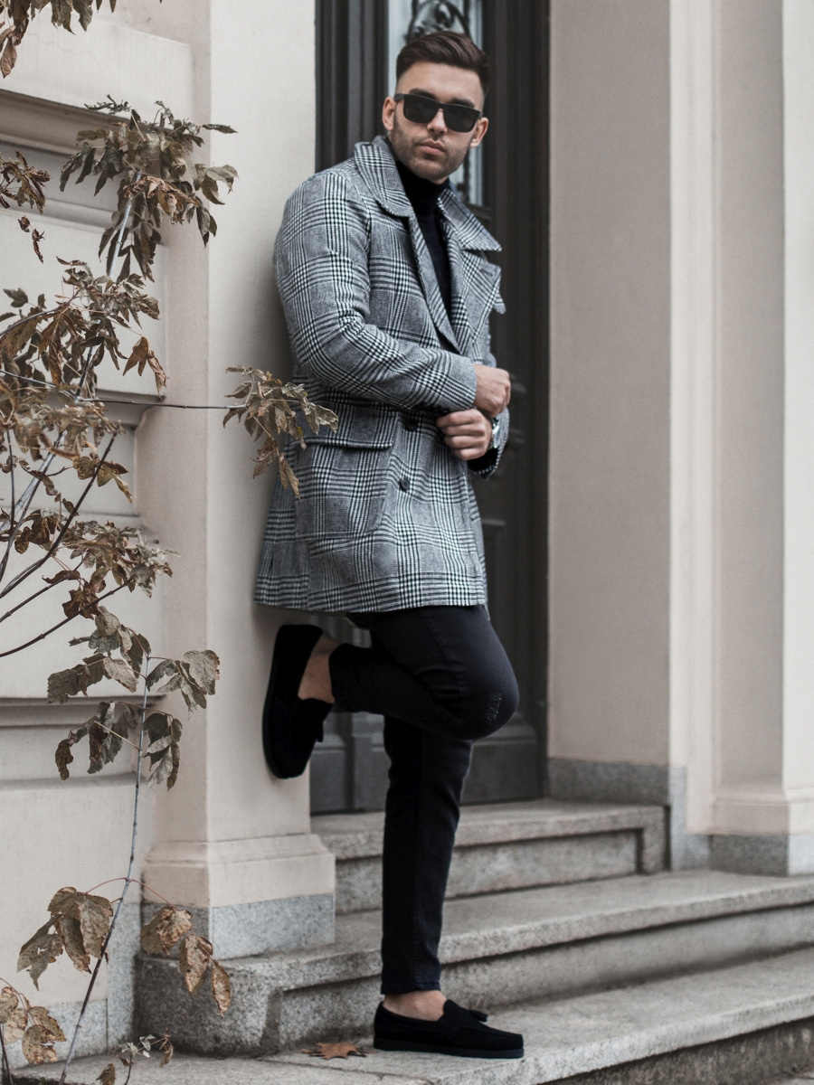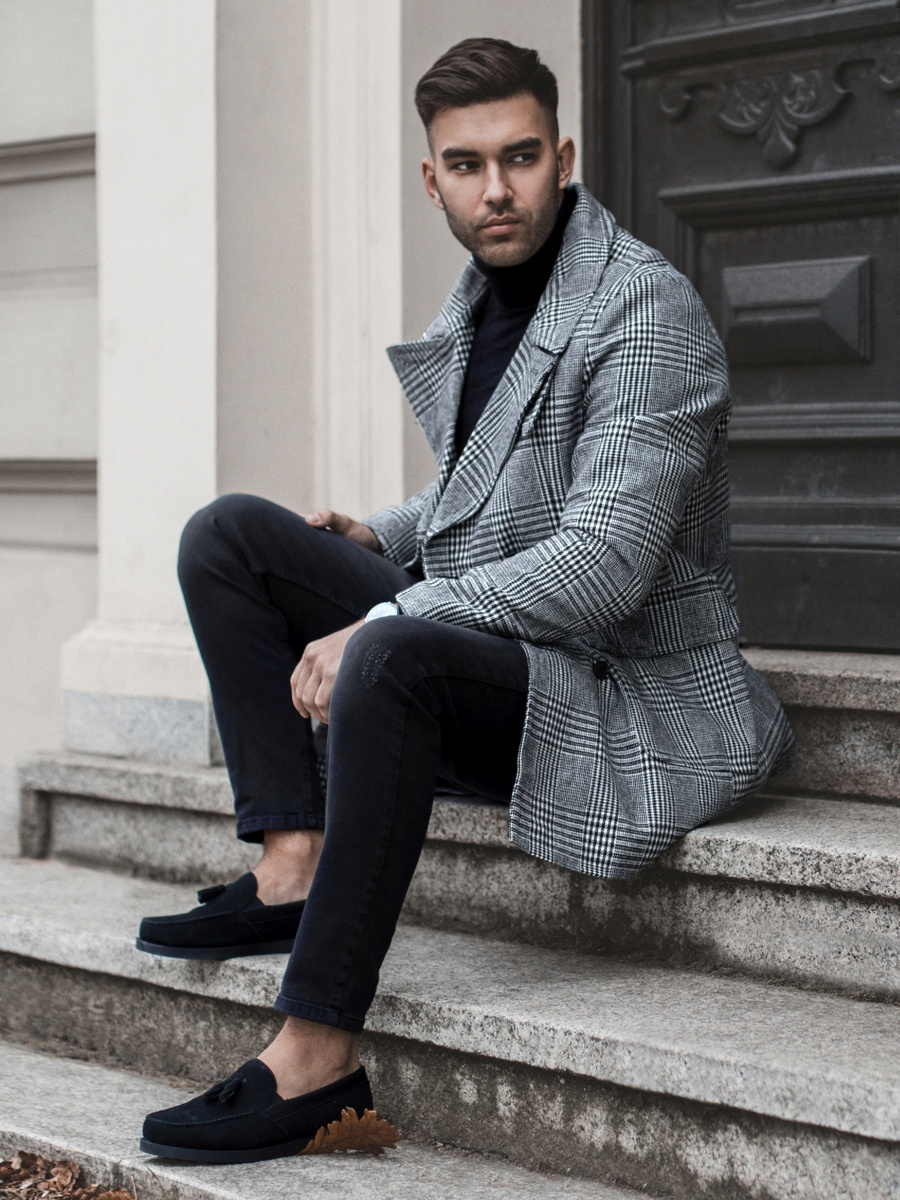 - SWETER TYPU GOLF WYKONANY Z MIĘKKIEJ DZIANINY ORAZ JEANSY MĘSKIE TYPU RURKI. PŁASZCZ