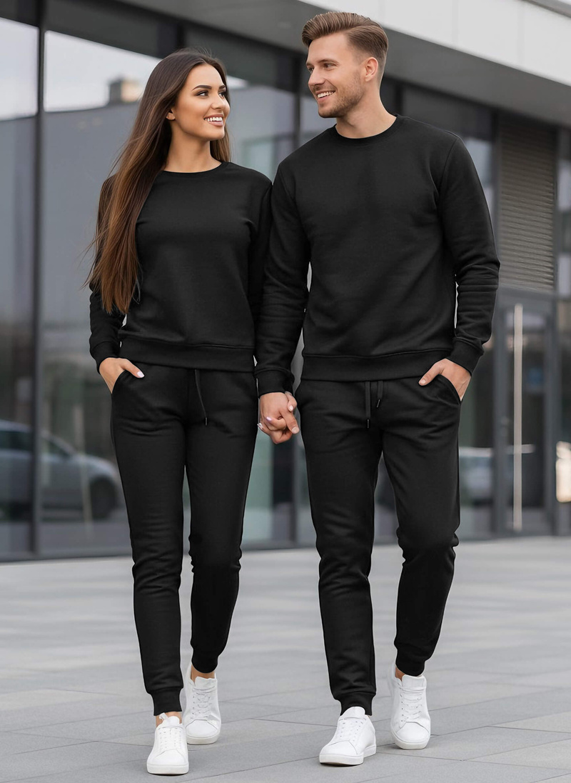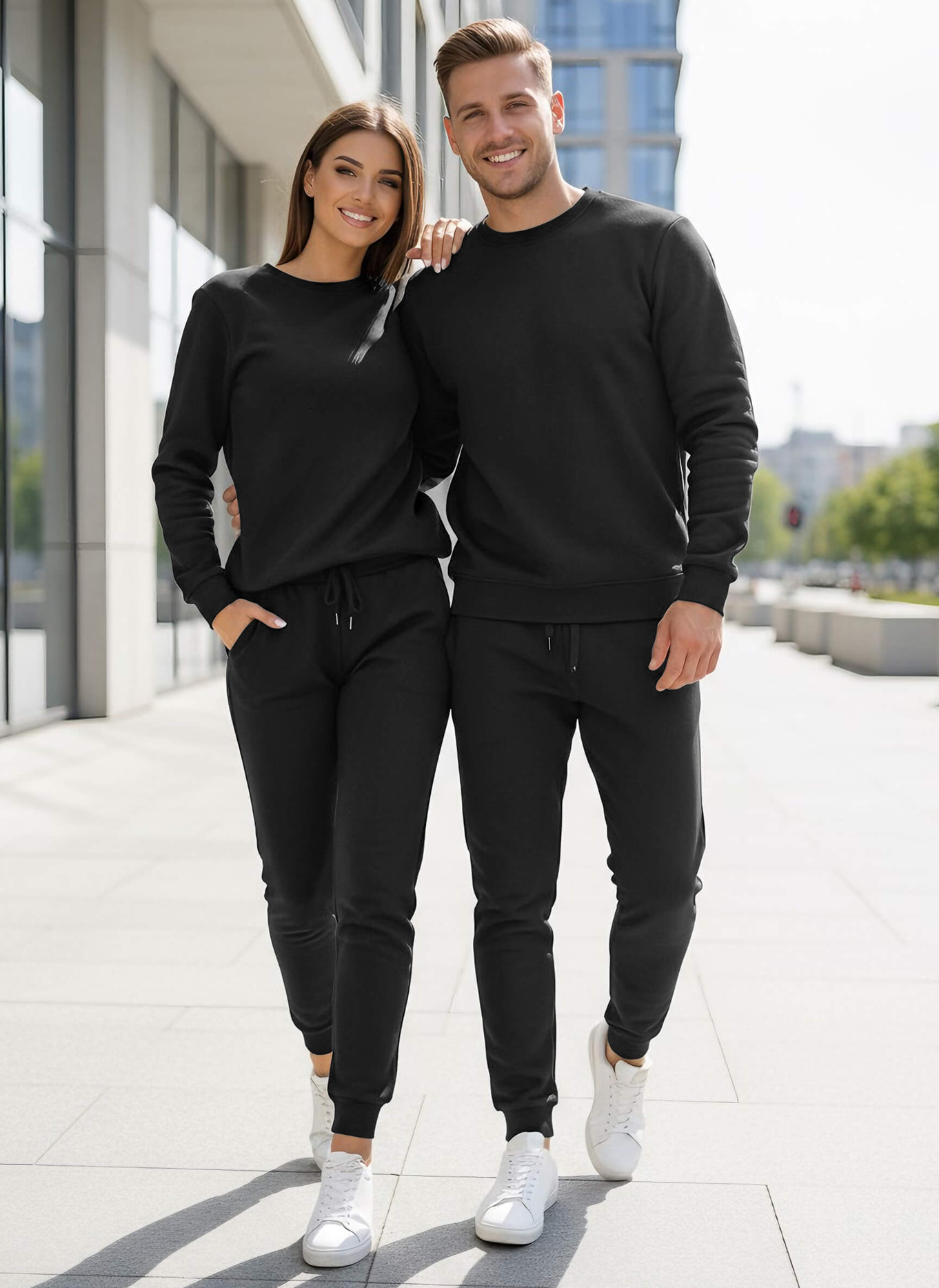 Komplet dresowy dla par składa się z bluzy z długim rękawem, kapturem i ściągaczami oraz spodni z kieszeniami po bokach i ściągaczami. Został on wykonany z połączenia bawełny i poliestru. Sprawia to, że bardzo ładnie dopasowuje się do sylwetki, jest miękki, przyjemny w dotyku, wygodny w noszeniu i odporny na uszkodzenia oraz zagniecenia.