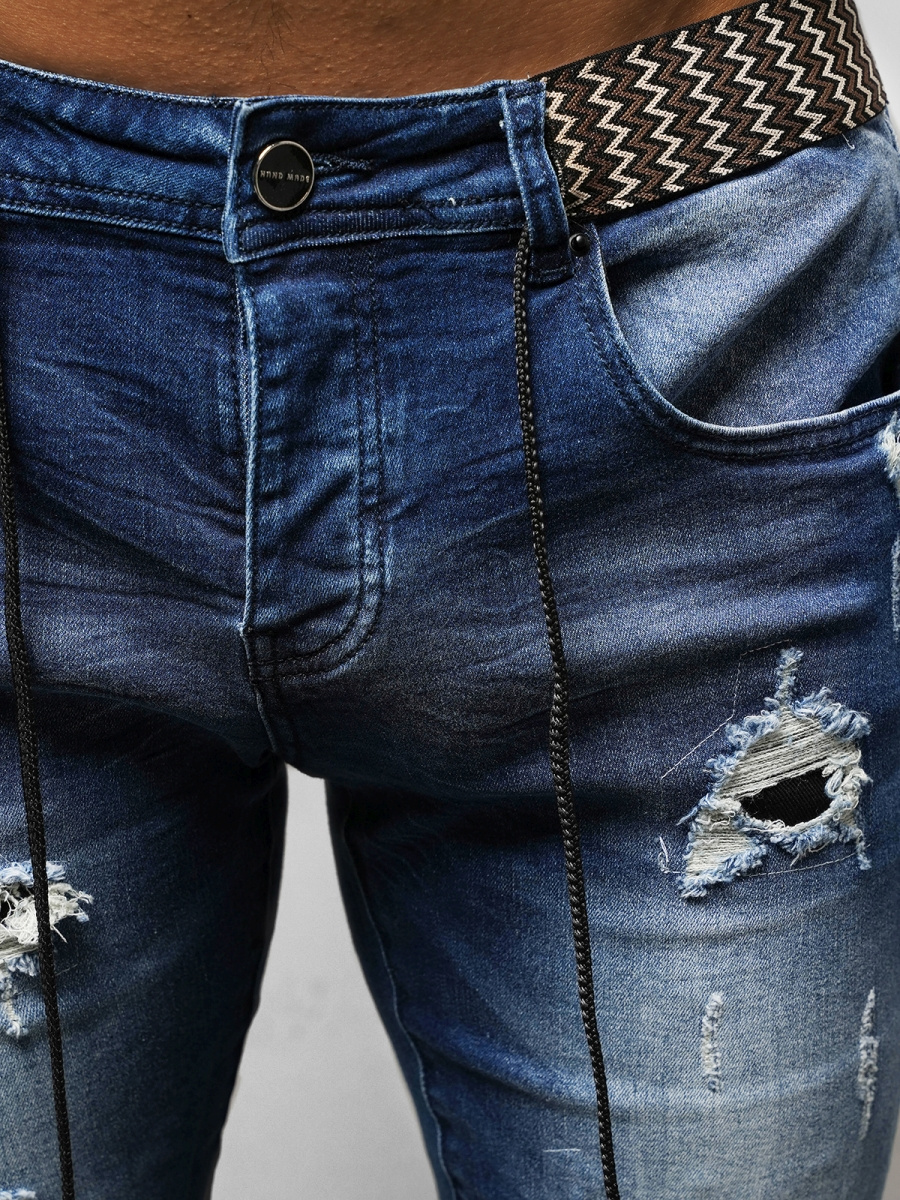 Spodnie pochodzą z naszej najnowszej kolekcji. Mają fason typu slim fit, którego cechą charakterystyczną są wąskie nogawki. Ozdobna wstawka imitująca pasek oraz przetarcia na nogawkach sprawiają, że jeansy wyglądają bardzo efektownie. Po bokach oraz z tłu znajdują się kieszenie, do których można schować smartfona, klucze czy portfel. Jeansy zostały wyprodukowane z połączenia bawełny, poliestru oraz elastanu, dzięki czemu są wygodne w noszeniu, ładnie układają się na ciele i są odporne na zaplamienia oraz zagniecenia.