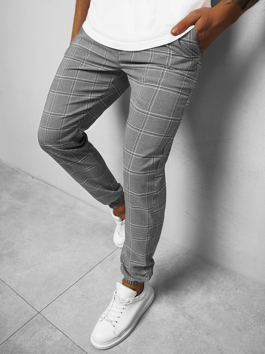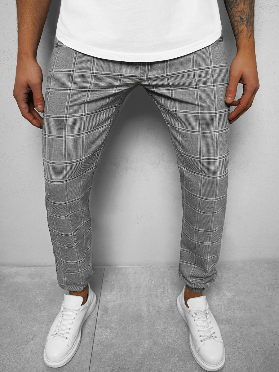 Spodnie pochodzą z najnowszej kolekcji. Ładnie dopasowują się do sylwetki i są wygodne w noszeniu. Spodnie pokrywa uniwersalny, ponadczasowy wzór w kratę, który nigdy nie wychodzi z mody i pasuje każdemu mężczyźnie. Z przodu oraz z tyłu joggerów znajdują się praktyczne kieszenie, do których można schować niezbędne drobiazgi. Pas oraz nogawki spodni zostały wykończone ściągaczami, które nadają im sportowego charakteru.