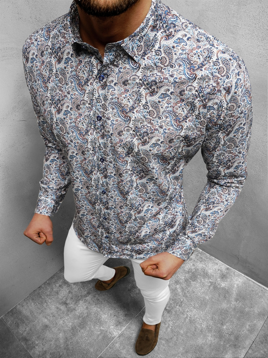 Wzorzysta koszula to ciekawy sposób na ożywienie eleganckiej, męskiej stylizacji. Z powodzeniem można ją założyć na randkę, wesele czy wyjście do klubu. Koszula będzie bardzo dobrze pasowała do innych męskich ubrań dostępnych w asortymencie naszego sklepu internetowego. Można ją zestawić na przykład z marynarką i materiałowymi spodniami. Równie dobrze będzie ona wyglądała razem ze swetrem i jeansami.