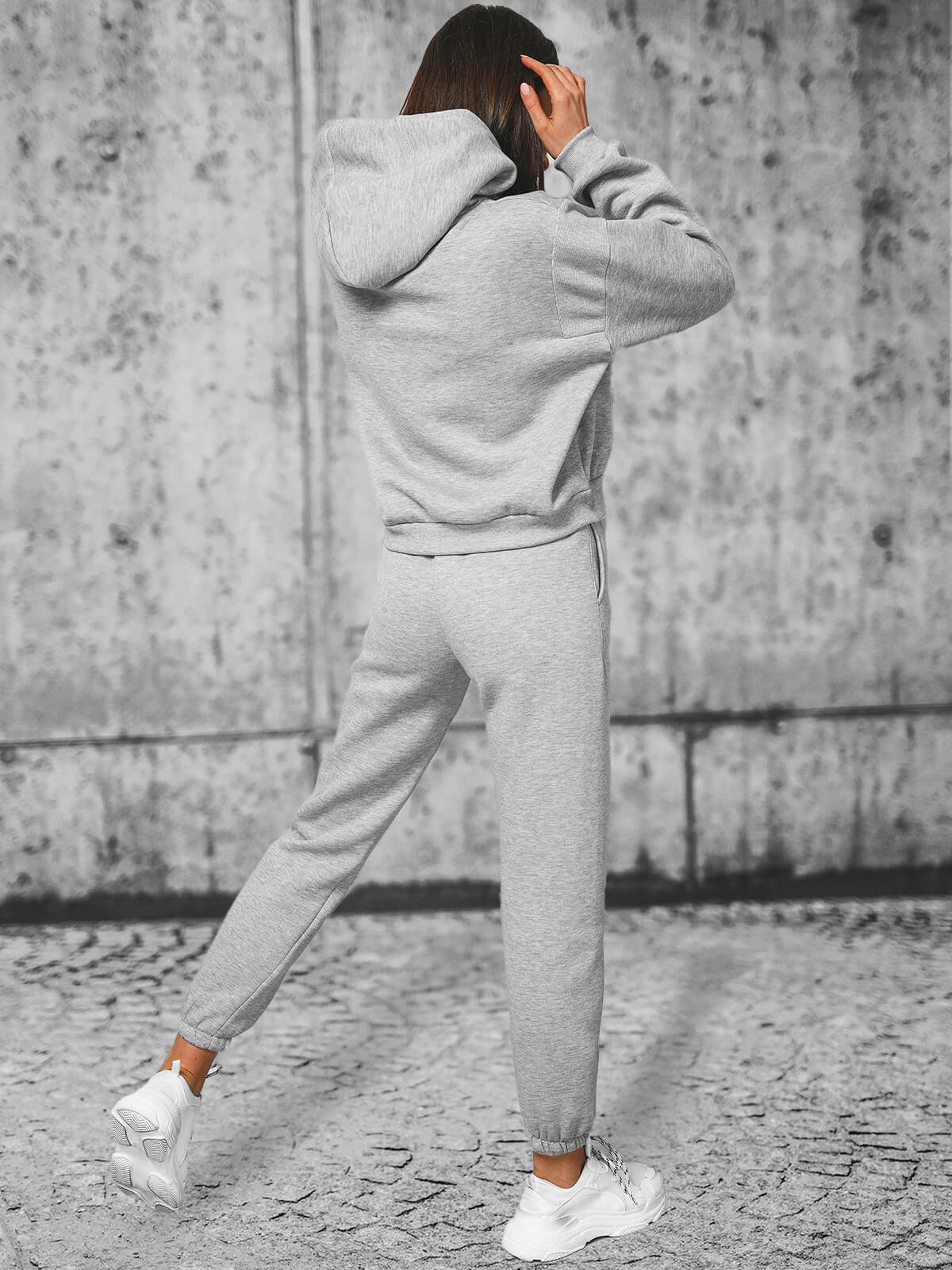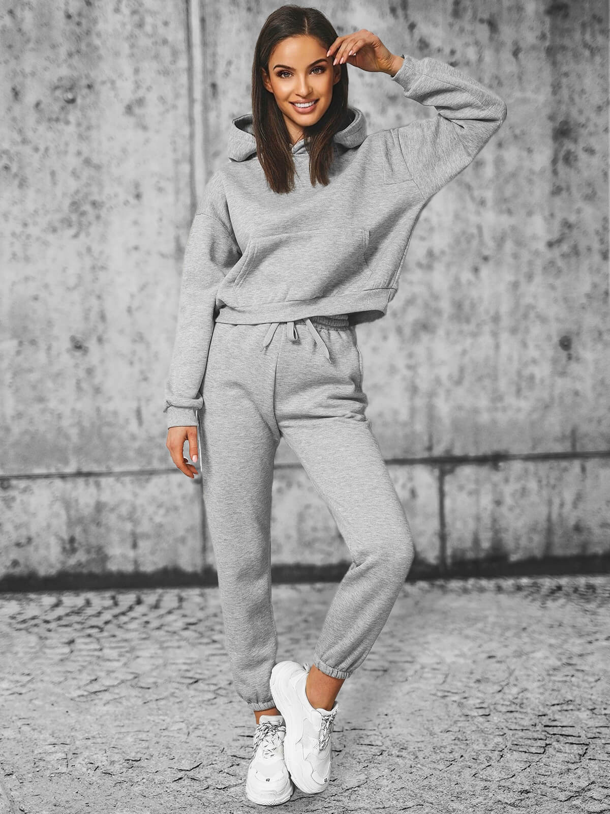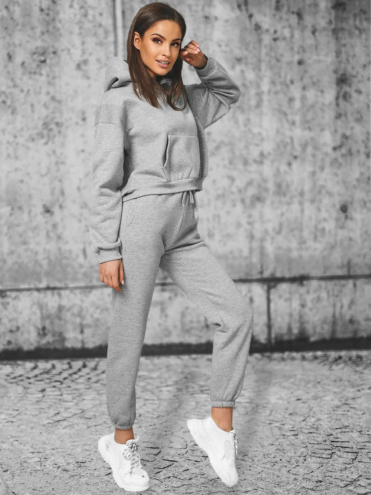 W skład damskiego zestawu dresowego wchodzą dwa elementy. Jednym z nich jest wkładana przez głowę bluza ze ściągaczem, kapturem i kieszenią typu kangurka, drugim — spodnie wykończone ściągaczem z kieszeniami po bokach, do których można schować niezbędne drobiazgi. Komplet został wykonany z połączenia bawełny oraz poliestru. Sprawia to, że jest wygodny w noszeniu, przyjemny w dotyku i ładnie układa się na ciele.