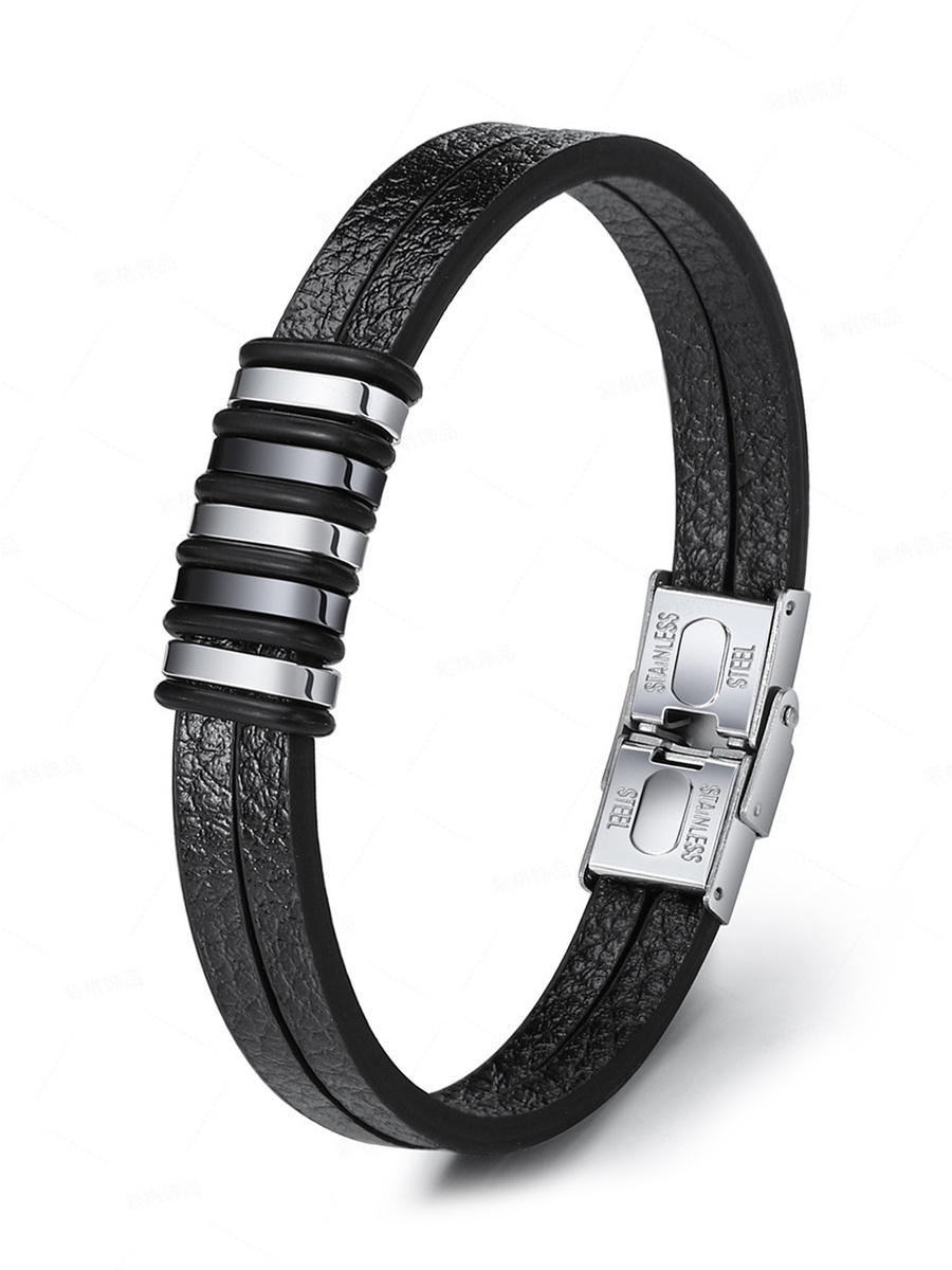 Komplet składa się z zestawu bransoletek wykonanych z wysokiej jakości skóry ekologicznej o plecionym wzorze oraz rzemyków w kolorze czarnym. Na przodzie znajduje się ozdobna metalowa wstawka. Obwód bransoletek jest regulowany sznurkami w zakresie od 16 do 24 centymetrów. Jedna z nich jest zapinana na napy i ma obwód 20 centymetrów.