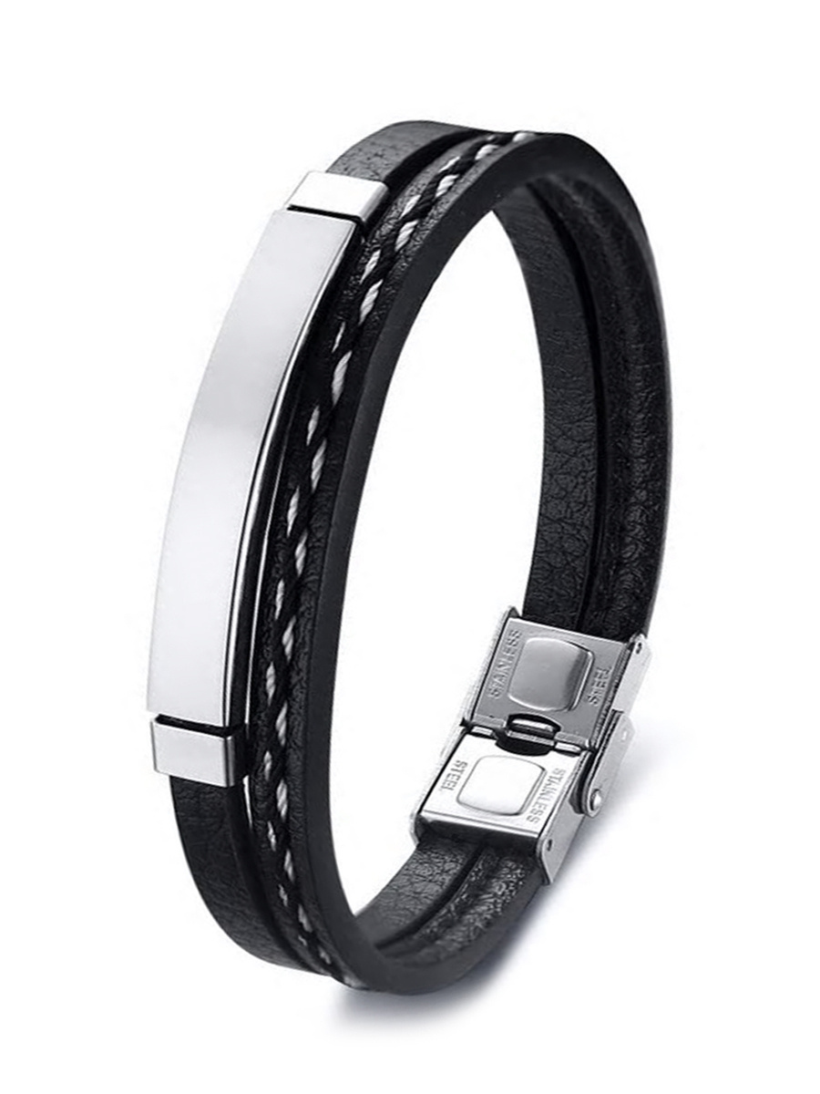 Komplet składa się z zestawu bransoletek wykonanych z wysokiej jakości skóry ekologicznej o plecionym wzorze oraz rzemyków w kolorze czarnym. Na przodzie znajduje się ozdobna metalowa wstawka. Obwód bransoletek jest regulowany sznurkami w zakresie od 16 do 24 centymetrów. Jedna z nich jest zapinana na napy i ma obwód 20 centymetrów.