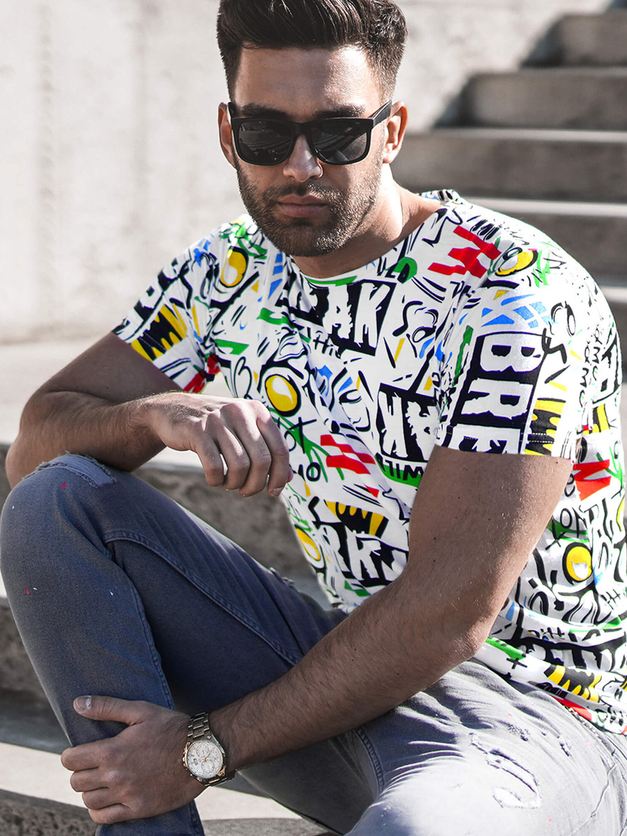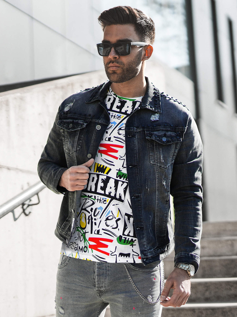 - T-SHIRT MĘSKI Z NADRUKIEM ORAZ SPODNIE JEANSOWE. KURTKA