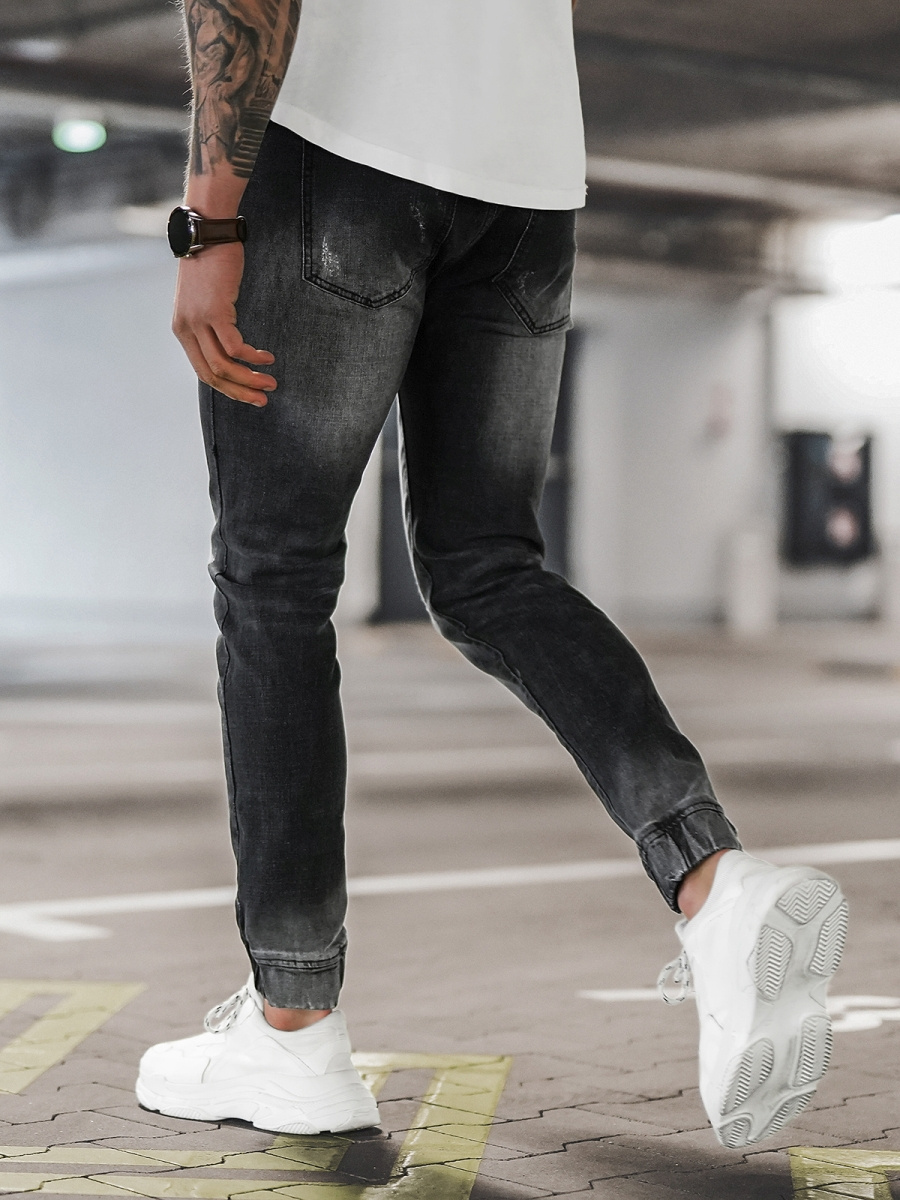 Spodnie mają fason typu joggery. Ich cechą charakterystyczną są znajdujące się przy nogawkach oraz w pasie ściągacze nadające sportowego charakteru oraz chroniące przed przekręcaniem się. Po bokach oraz z tyłu umieszczono kieszenie, do których można schować klucze, telefon, chusteczki czy portfel. Na nogawkach umieszczono przetarcia, które sprawiają, że joggery prezentują się bardzo oryginalnie. Model ten został wykonany z połączenia bawełny, poliestru, wiskozy oraz elastanu. Dzięki temu, spodnie są wygodne w noszeniu, przyjemne w dotyku i ładnie dopasowują się do sylwetki.