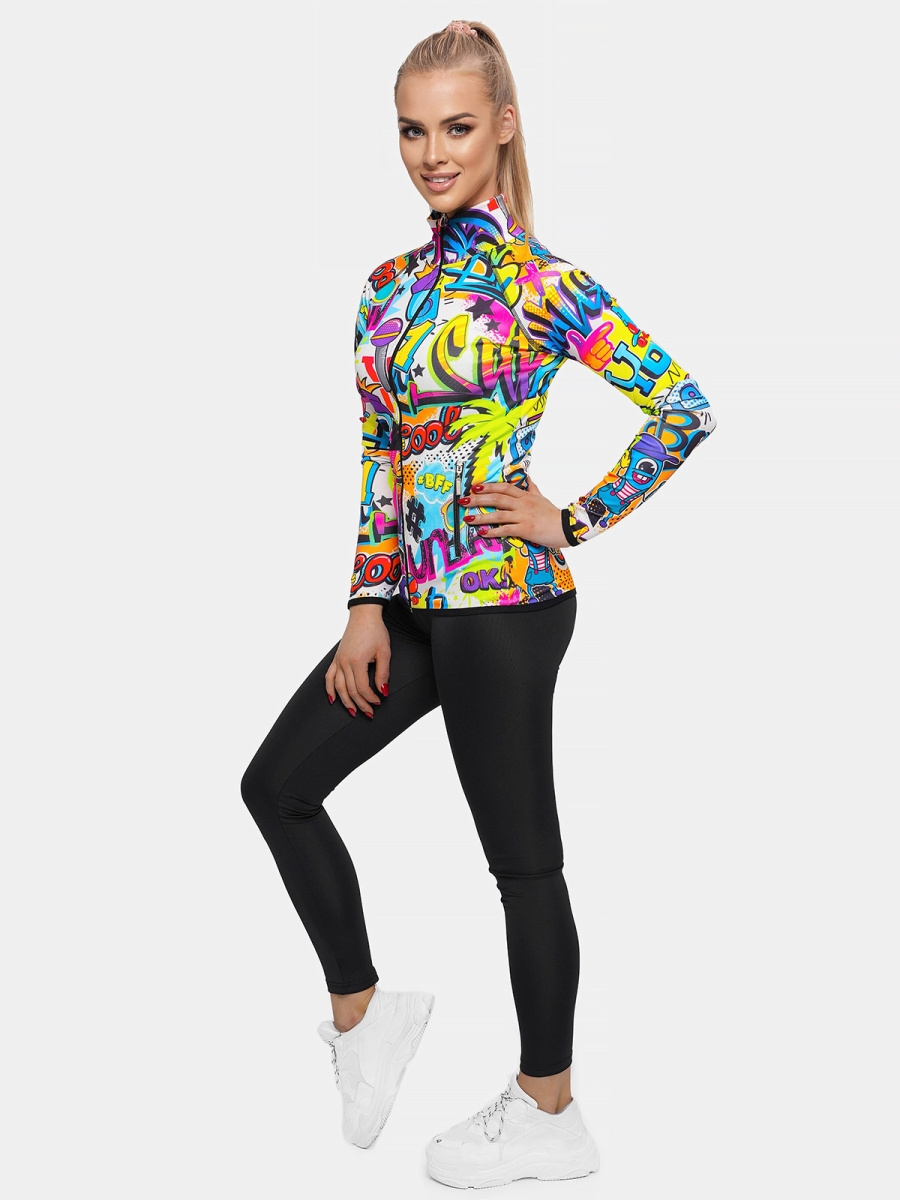 Komplet składa się z 2 elementów. Są nimi legginsy oraz rozpinana bluza z kieszeniami po bokach i wzorzystym, kolorowym nadrukiem. Zestaw został wykonany z wysokiej jakości poliestru z domieszką elastanu. Sprawia to, że ładnie dopasowuje się do sylwetki, nie rozciąga się z czasem i nie gniecie.