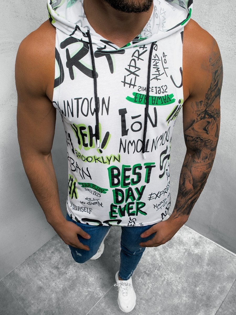 Koszulka pochodzi z nowej kolekcji. Nie posiada rękawów. Koszulka ma praktyczny kaptur, który nadaje jej sportowego charakteru i bardzo dobrze sprawdza się w wietrzne, deszczowe dni. Z przodu oraz z tyłu koszulki znajduje się oryginalny nadruk. Została ona wykonana z połączenia bawełny oraz poliestru. Sprawia to, że jest wygodna w noszeniu, przyjemna w dotyku, nie rozciąga się, nie gniecie i ładnie dopasowuje do sylwetki.