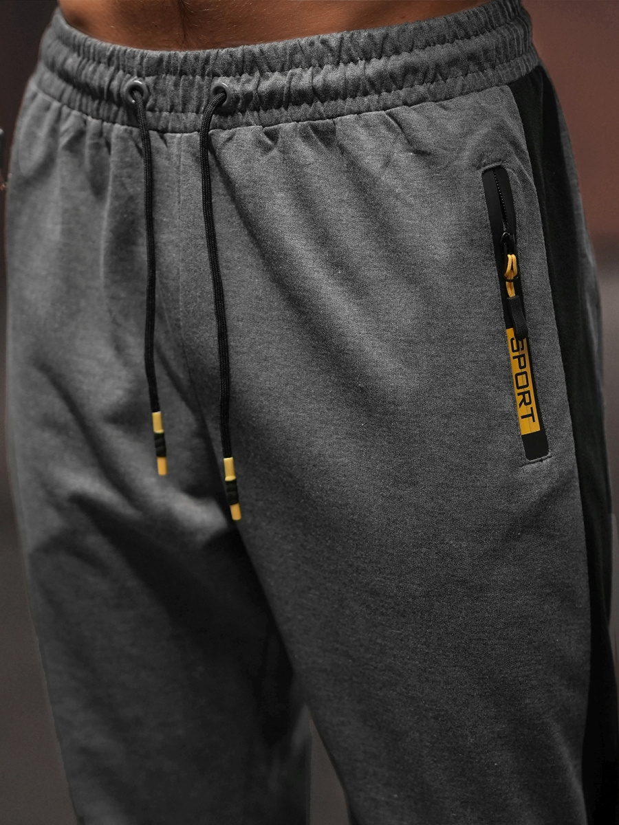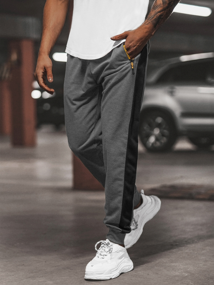Spodnie pochodzą z najnowszej kolekcji. Mają fason typu jogger. W pasie oraz przy nogawkach znajdują się ściągacze nadające im sportowego charakteru. Po bokach umieszczono praktyczne kieszenie na zamek błyskawiczny, do których można schować klucze, portfel czy telefon. Dzięki kontrastowym lampasom po bokach, joggery prezentują się bardzo oryginalnie. Zostały one wykonane z połączenia wysokiej jakości bawełny oraz poliestru, co sprawia, że są wygodne w noszeniu i przyjemne w dotyku.