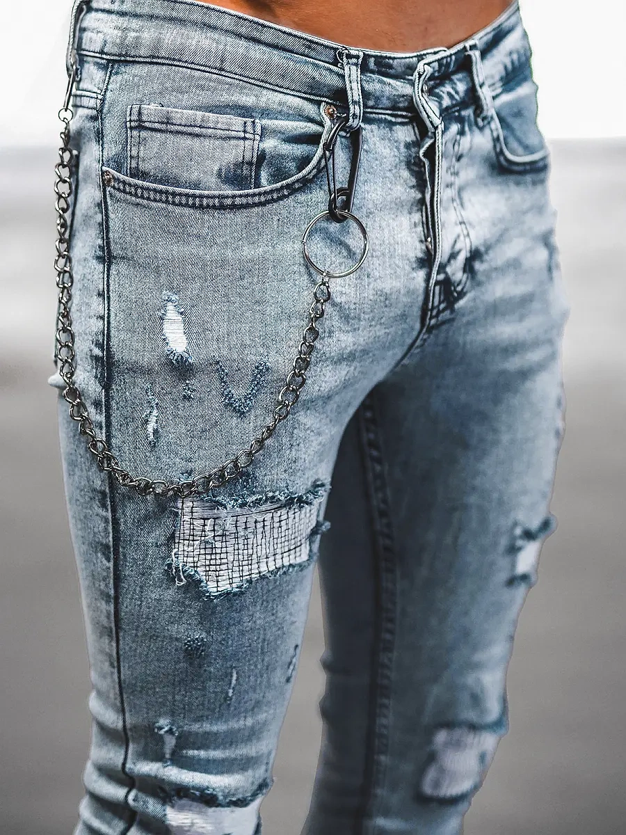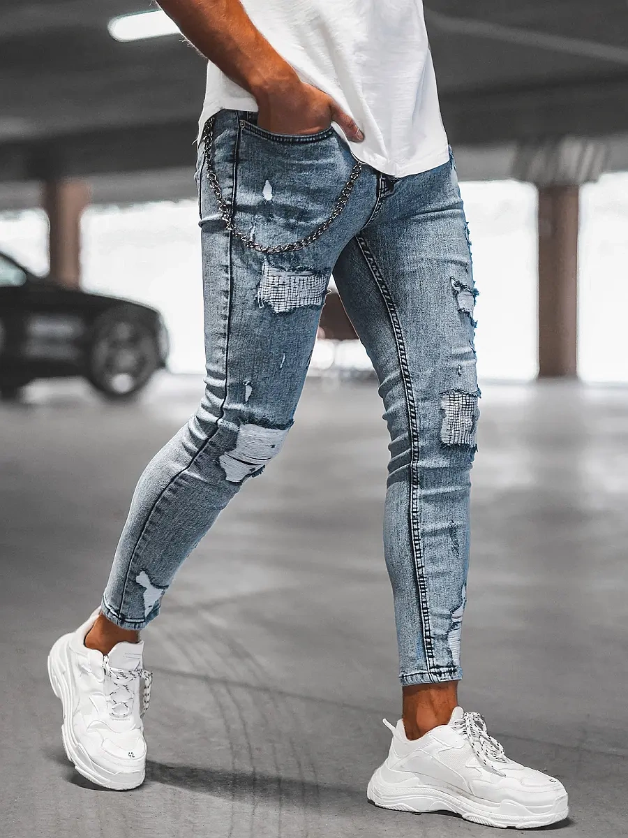 Jeansy zostały wykonane z bawełny z domieszką elastanu, dzięki czemu ładnie układają się na ciele, są przyjemne w dotyku, miękkie i wygodne w noszeniu. Mają fason typu slim fit, czyli z wąskimi nogawkami. Oryginalnego wyglądu nadają im znajdujące się na nogawkach przetarcia oraz odpinany, ozdobny łańcuch. Z przodu oraz z tyłu spodni umieszczono kieszenie, które z łatwością pomieszczą wszystkie niezbędne drobiazgi, takie jak klucze, telefon czy portfel.