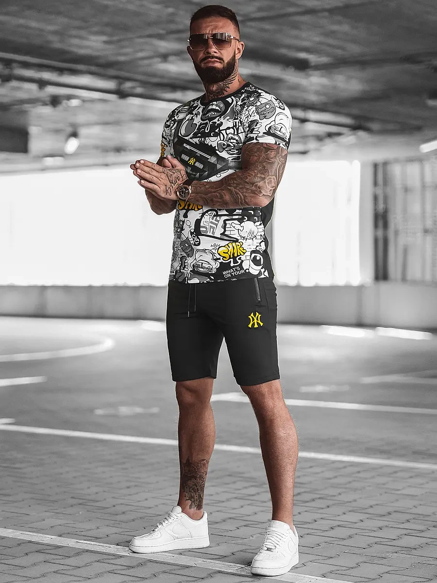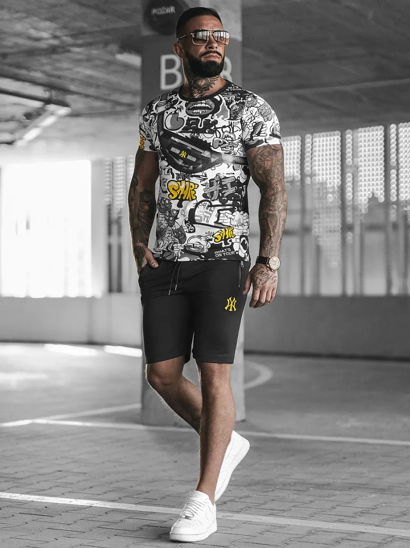 Zestaw męski składa się z koszulki z designerskim, komiksowym nadrukiem oraz spodenek z kieszeniami po bokach na zamek błyskawiczny, do których można schować drobiazgi, takie jak klucze, telefon czy portfel. Komplet został wykonany z bawełny z domieszką elastanu, dzięki czemu jest wygodny w noszeniu, przyjemny w dotyku, nie krępuje ruchów i ładnie dopasowuje się do sylwetki.