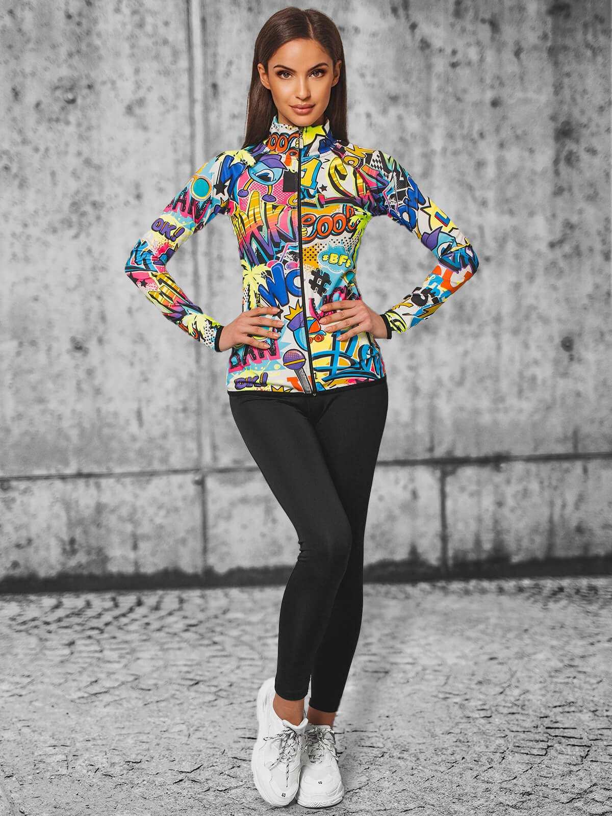 Komplet składa się z 2 elementów. Są nimi legginsy oraz rozpinana bluza z kieszeniami po bokach i wzorzystym, kolorowym nadrukiem. Zestaw został wykonany z wysokiej jakości poliestru z domieszką elastanu. Sprawia to, że ładnie dopasowuje się do sylwetki, nie rozciąga się z czasem i nie gniecie.