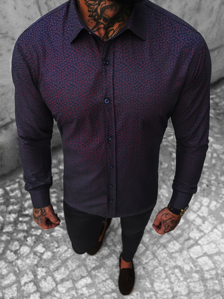 Koszula pochodzi z naszej najnowszej kolekcji. Ma długi rękaw, zapięcie na guziki oraz kołnierzyk typu kent. Koszula posiada fason typu slim fit, czyli dopasowany do sylwetki. Ma kolor granatowy i zdobi ją drobny, czerwony wzór. Koszula została wykonana z połączenia bawełny oraz poliestru, co sprawia, że jest wygodna w noszeniu, przyjemna w dotyku i ładnie układa się na ciele.