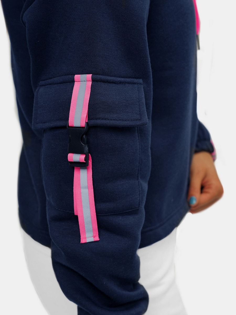 Bluza jest wkładana przez głowę. Jej dół i rękawy zostały wykończone ściągaczami, które skutecznie chronią przed przekręcaniem się podczas noszenia. Bluza ma praktyczny kaptur zabezpieczający przed deszczem i chłodnymi podmuchami wiatru. Oryginalnego wyglądu nadaje jej ozdobna lamówka na lewym rękawie i zapinana kieszonka na prawym rękawie, do której można schować klucze czy telefon. Bluza została wykonana z połączenia bawełny oraz poliestru, dzięki czemu ładnie dopasowuje się do sylwetki, jest przyjemna w dotyku i miękka.