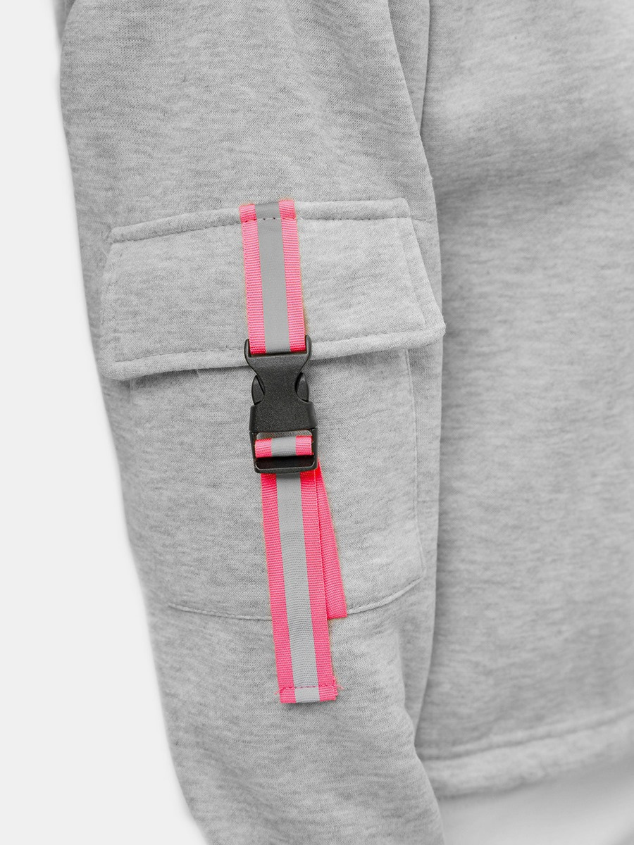 Bluza jest wkładana przez głowę. Jej dół i rękawy zostały wykończone ściągaczami, które skutecznie chronią przed przekręcaniem się podczas noszenia. Bluza ma praktyczny kaptur zabezpieczający przed deszczem i chłodnymi podmuchami wiatru. Oryginalnego wyglądu nadaje jej ozdobna lamówka na lewym rękawie i zapinana kieszonka na prawym rękawie, do której można schować klucze czy telefon. Bluza została wykonana z połączenia bawełny oraz poliestru, dzięki czemu ładnie dopasowuje się do sylwetki, jest przyjemna w dotyku i miękka.