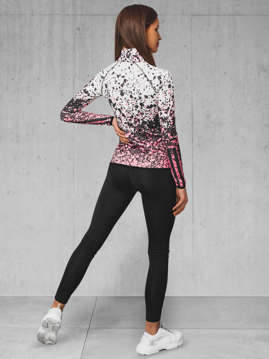 W skład kompletu wchodzą 2 elementy. Są nimi rozpinana bluza z kieszeniami po bokach oraz legginsy. Całość zdobi efektowny, kontrastowy wzór. Zestaw został wykonany z wysokiej jakości poliestru z domieszką elastanu. Sprawia to, że ładnie dopasowuje się on do sylwetki, nie rozciąga się i nie gniecie.