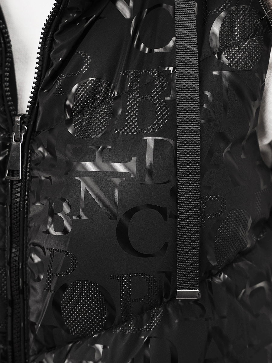 Kamizelka pochodzi z najnowszej kolekcji. Jest zapinana na zamek błyskawiczny. Posiada dwie strony. Kamizelka ma kaptur, który skutecznie chroni przed chłodem, zimnym wiatrem, deszczem i śniegiem. Pokrywające ją pikowania nadają jej oryginalnego wyglądu. Po bokach kamizelki znajdują się praktyczne kieszenie, do których można schować klucze, telefon czy portfel. Została ona wykonana z połączenia poliestru oraz poliuretanu, a jej podszewka — w całości z poliestru.