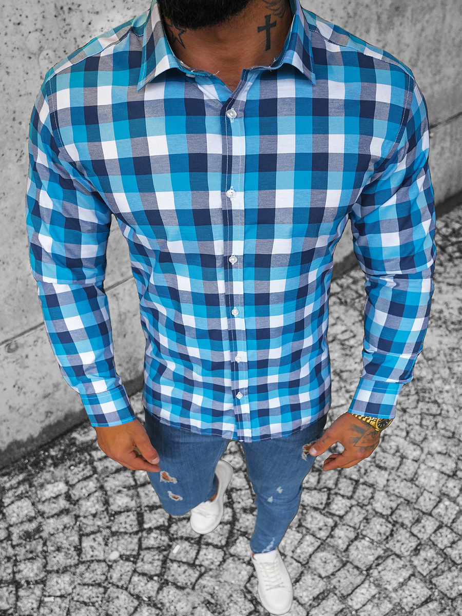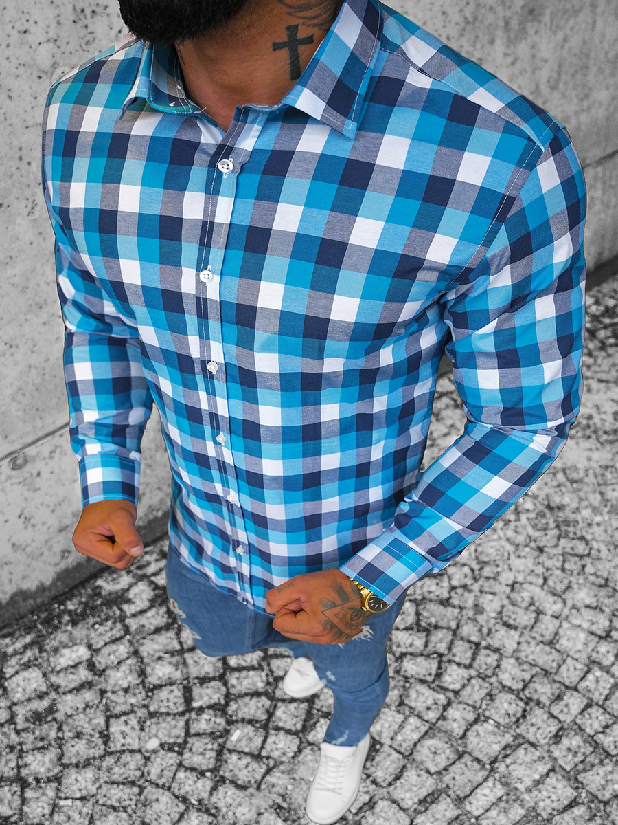 Koszula męska w kratę niebieska OZONEE O/1322Z