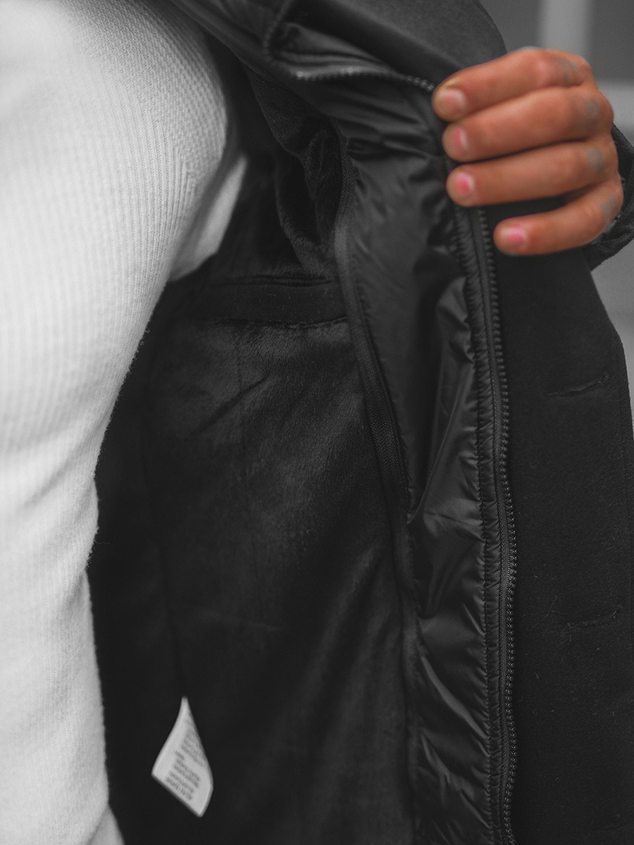 Płaszcz jest zapinany na 2 rzędy guzików. Posiada odpinany kołnierz typu stójka. Płaszcz jest ocieplany od wewnątrz, dzięki czemu skutecznie chroni przed zmarznięciem w chłodne dni. Posiada 2 kieszenie po bokach, 1 w środku i 2 na przodzie na zamek błyskawiczny, do których można schować wszystkie niezbędne drobiazgi. Został wykonany z wysokiej jakości poliestru, co sprawia, że ładnie dopasowuje się do sylwetki.