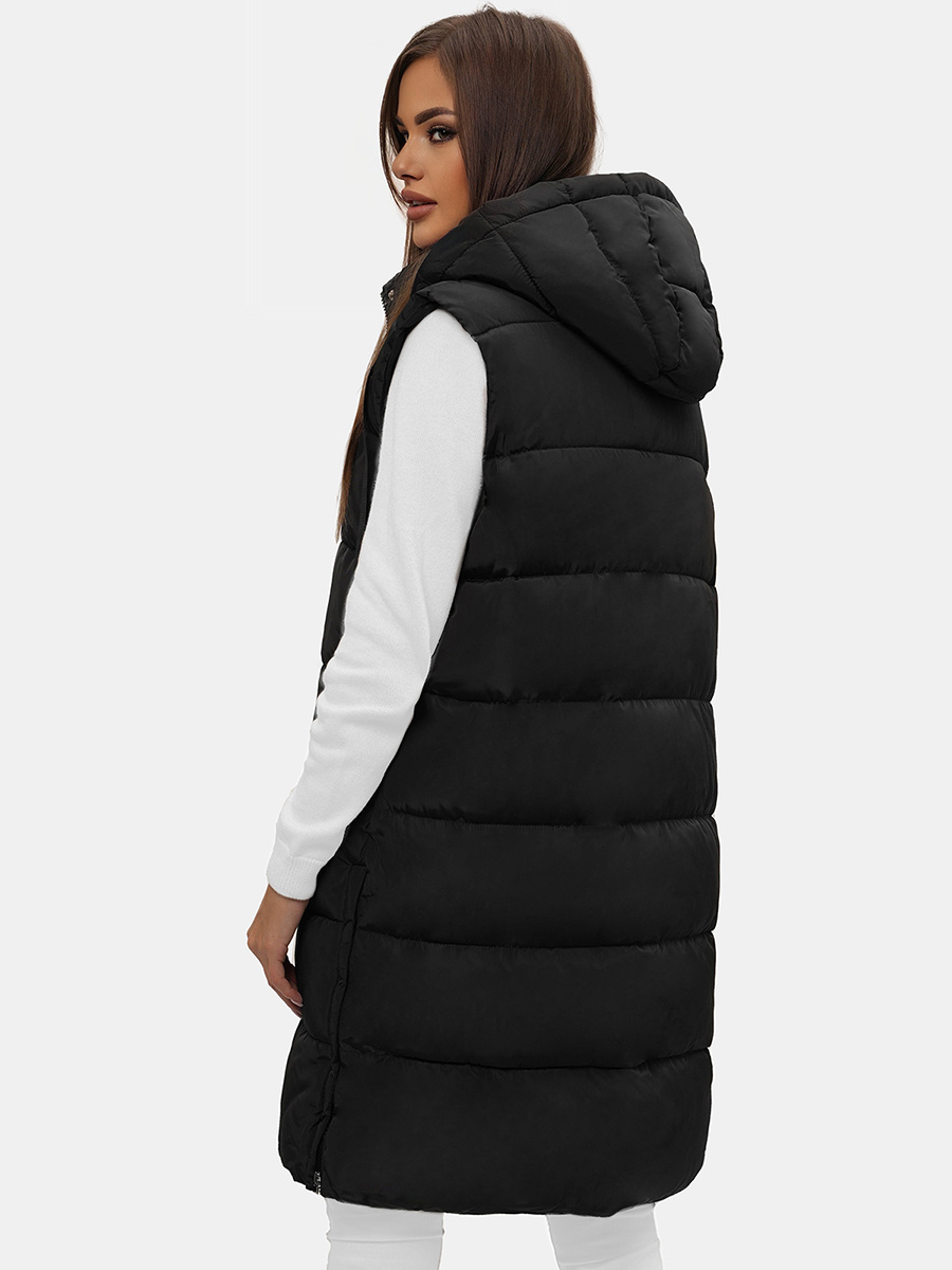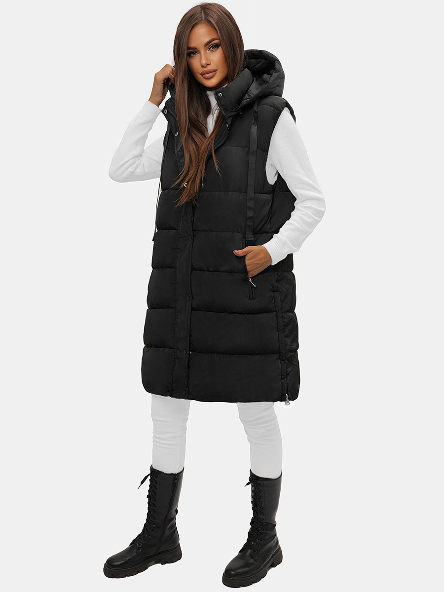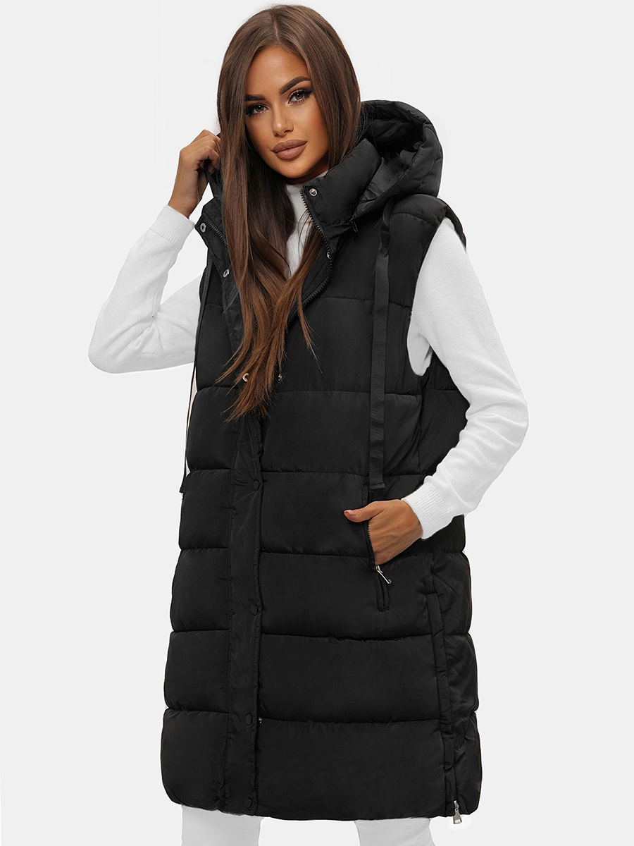 Kamizelka damska długa pikowana z kapturem czarna OZONEE O/81276