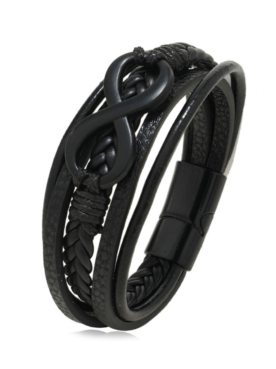 Komplet składa się z zestawu bransoletek wykonanych z wysokiej jakości skóry ekologicznej o plecionym wzorze oraz rzemyków w kolorze czarnym. Na przodzie znajduje się ozdobna metalowa wstawka. Obwód bransoletek jest regulowany sznurkami w zakresie od 16 do 24 centymetrów. Jedna z nich jest zapinana na napy i ma obwód 20 centymetrów.
