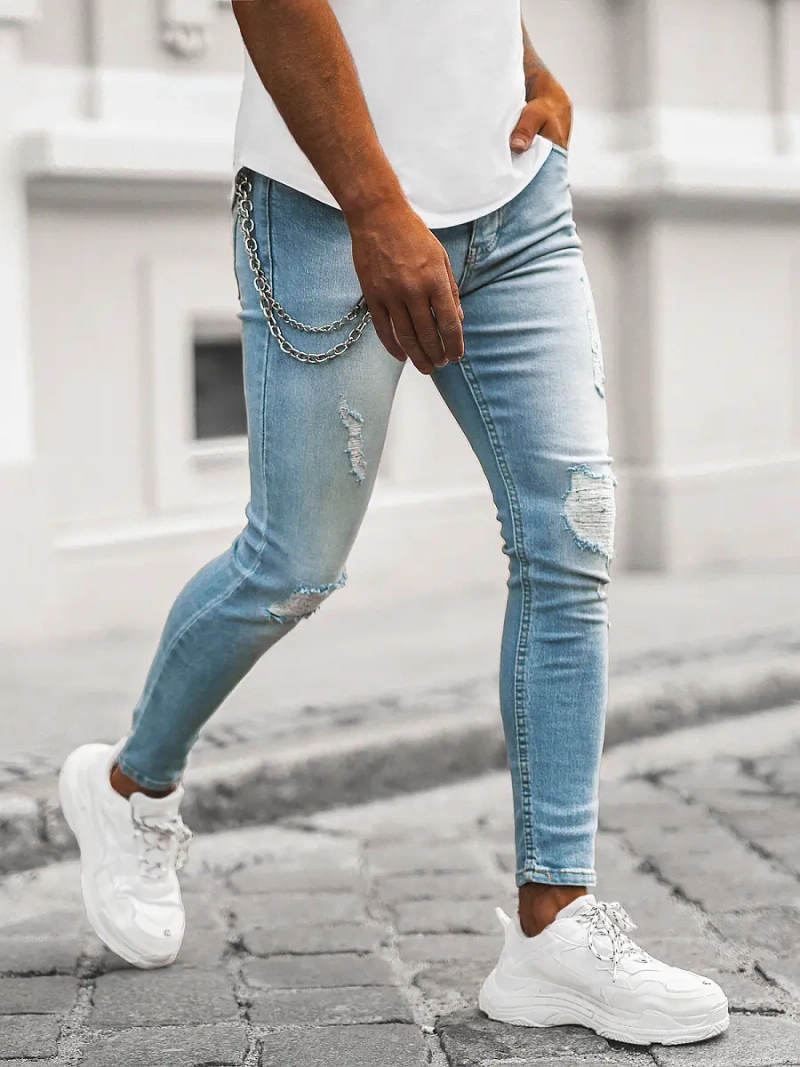 Jeansy mają fason typu slim fit, którego cechą charakterystyczną są wąskie nogawki. Po bokach oraz z tyłu znajdują się praktyczne kieszenie, do których można schować telefon, portfel czy klucze. Przetarcia na nogawkach oraz odpinany łańcuch nadają spodniom oryginalnego wyglądu. Zostały one wykonane z wysokiej jakości bawełny z domieszką elastanu, dzięki czemu dobrze dopasowują się do sylwetki, są wygodne w noszeniu, przyjemne w dotyku i odporne na uszkodzenia oraz zagniecenia.
