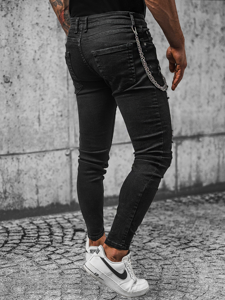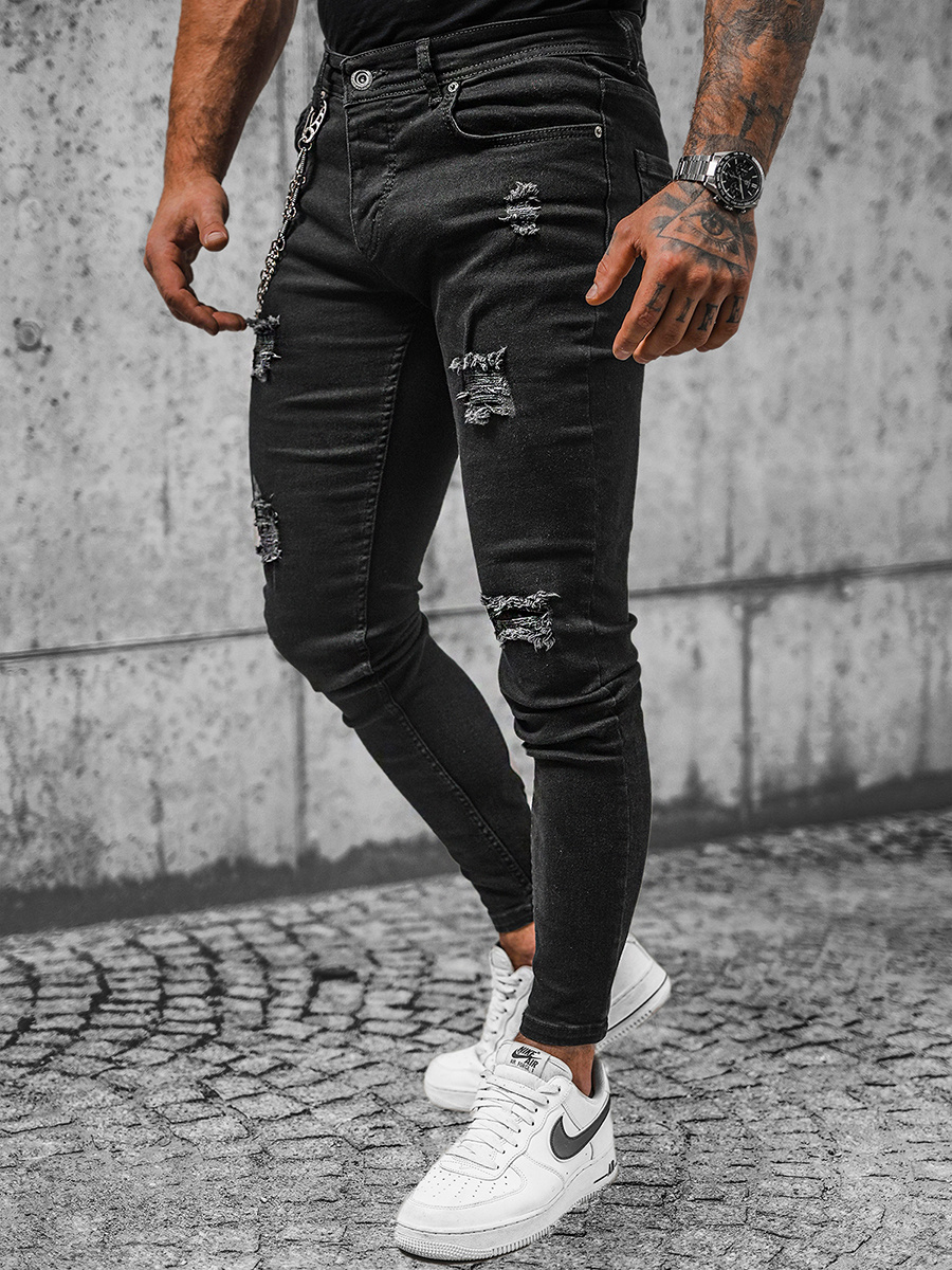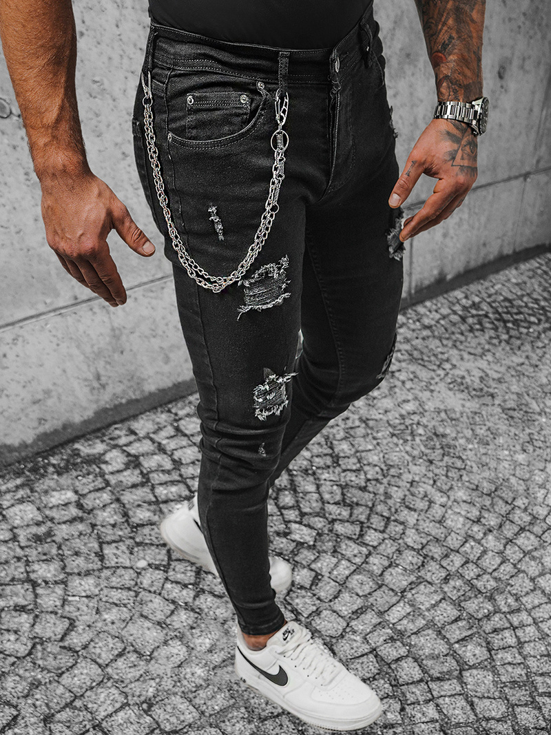 Spodnie mają fason typu slim fit, czyli z wąskimi nogawkami. Oryginalnego wyglądu nadają im ozdobne przetarcia oraz odpinany łańcuch. Z przodu oraz z tyłu jeansów znajdują się kieszenie, do których można schować niezbędne drobiazgi, takie jak klucze, telefon czy portfel. Spodnie zostały wykonane z wysokiej jakości bawełny z domieszką elastanu, co sprawia, że są wygodne w noszeniu, przyjemne w dotyku i ładnie dopasowują się do sylwetki.