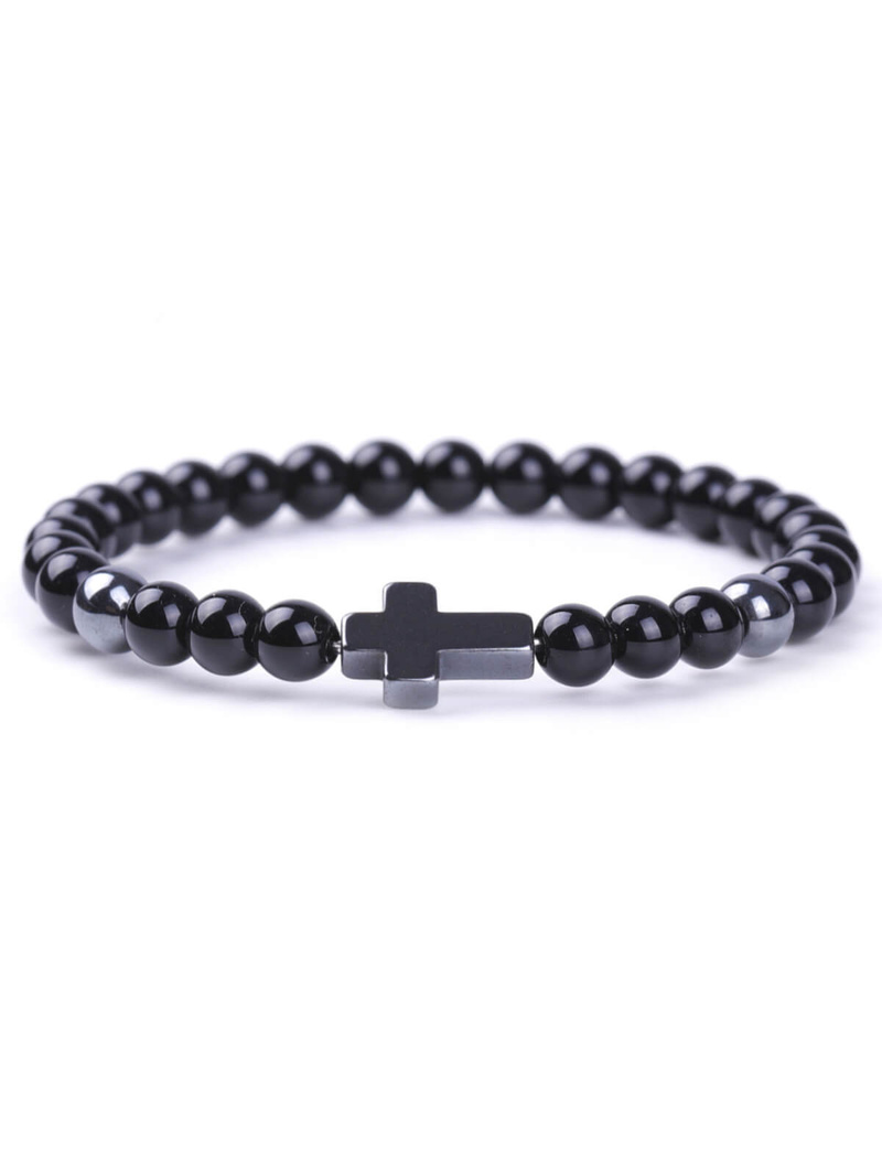 Bransoletka pochodzi z nowej kolekcji. Składa się z okrągłych, czarnych koralików oraz metalowych wstawek w kształcie krzyża. Znajdują się one na wytrzymałej, odpornej na zerwanie, rozciągliwej gumce, która z łatwością dopasowuje się do nadgarstka, gwarantując wysoki komfort noszenia.