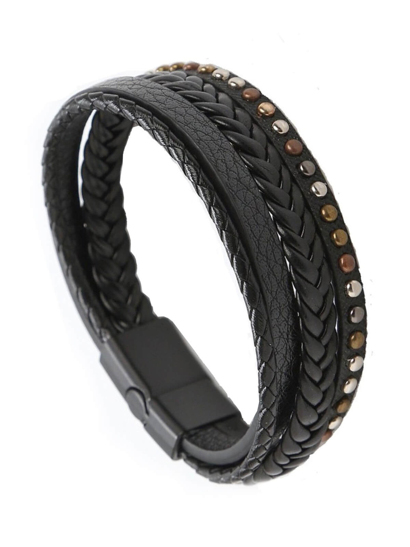 Komplet składa się z zestawu bransoletek wykonanych z wysokiej jakości skóry ekologicznej o plecionym wzorze oraz rzemyków w kolorze czarnym. Na przodzie znajduje się ozdobna metalowa wstawka. Obwód bransoletek jest regulowany sznurkami w zakresie od 16 do 24 centymetrów. Jedna z nich jest zapinana na napy i ma obwód 20 centymetrów.