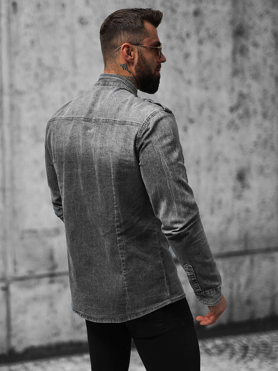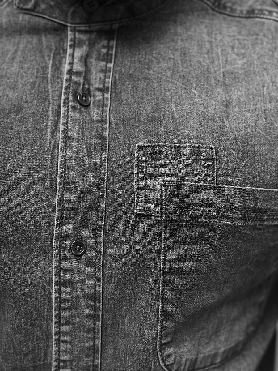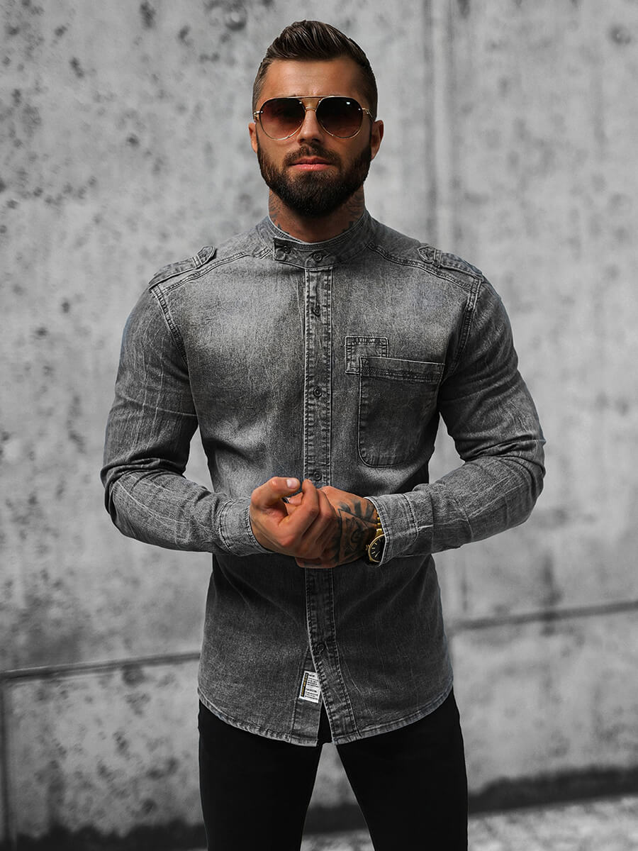 Koszula pochodzi z naszej najnowszej kolekcji. Ma długi rękaw, zapięcie na guziki i kołnierzyk typu stójka. Oryginalnego wyglądu nadaje jej znajdująca się z przodu kieszonka oraz umieszczone na rękawach pagony. Koszula została wykonana z wysokiej jakości bawełny z dodatkiem wiskozy oraz elastanu. Sprawia to, że jest wygodna w noszeniu, miła w dotyku, ładnie układa się na ciele i nie gniecie się.