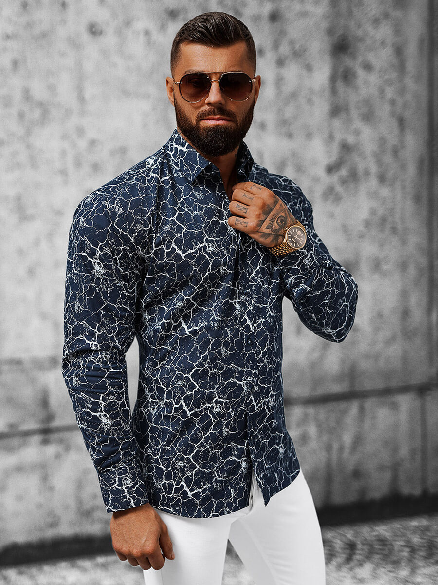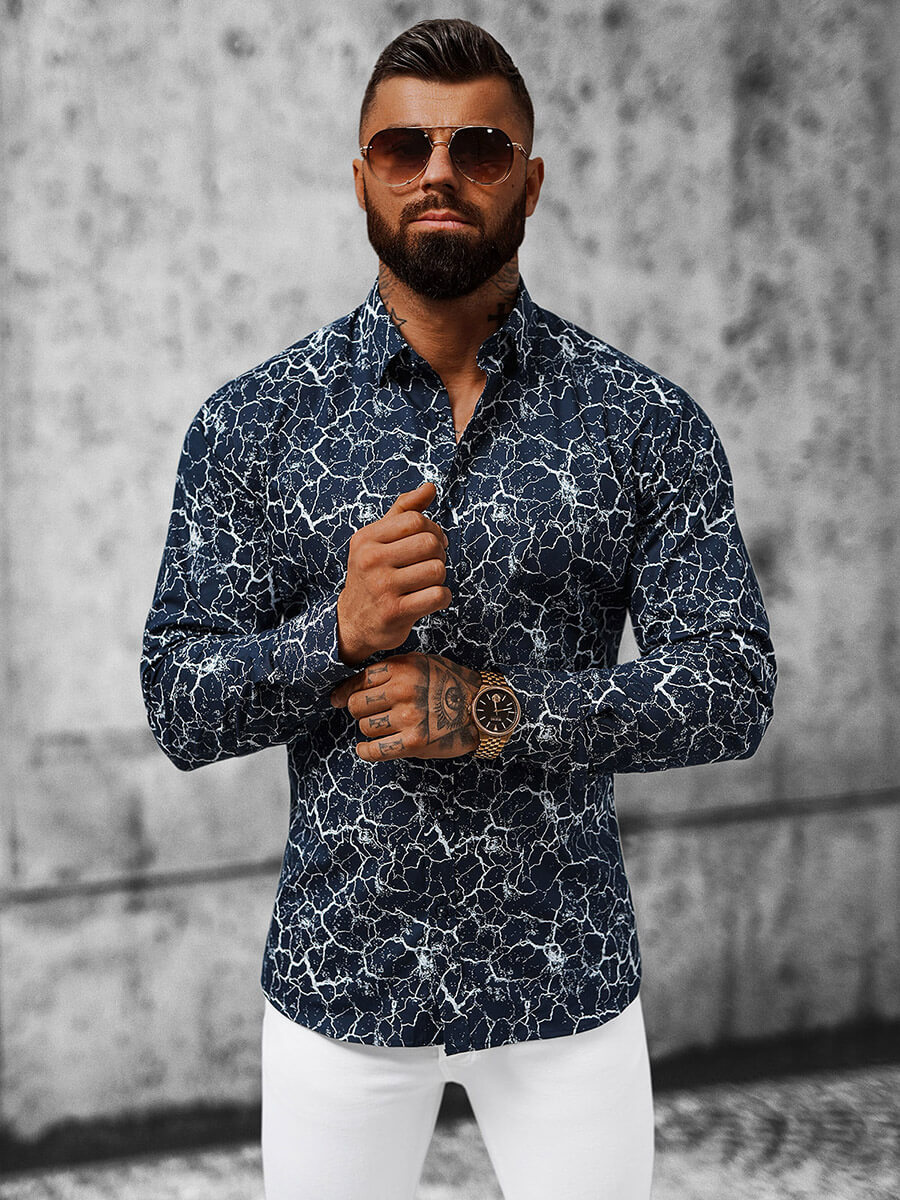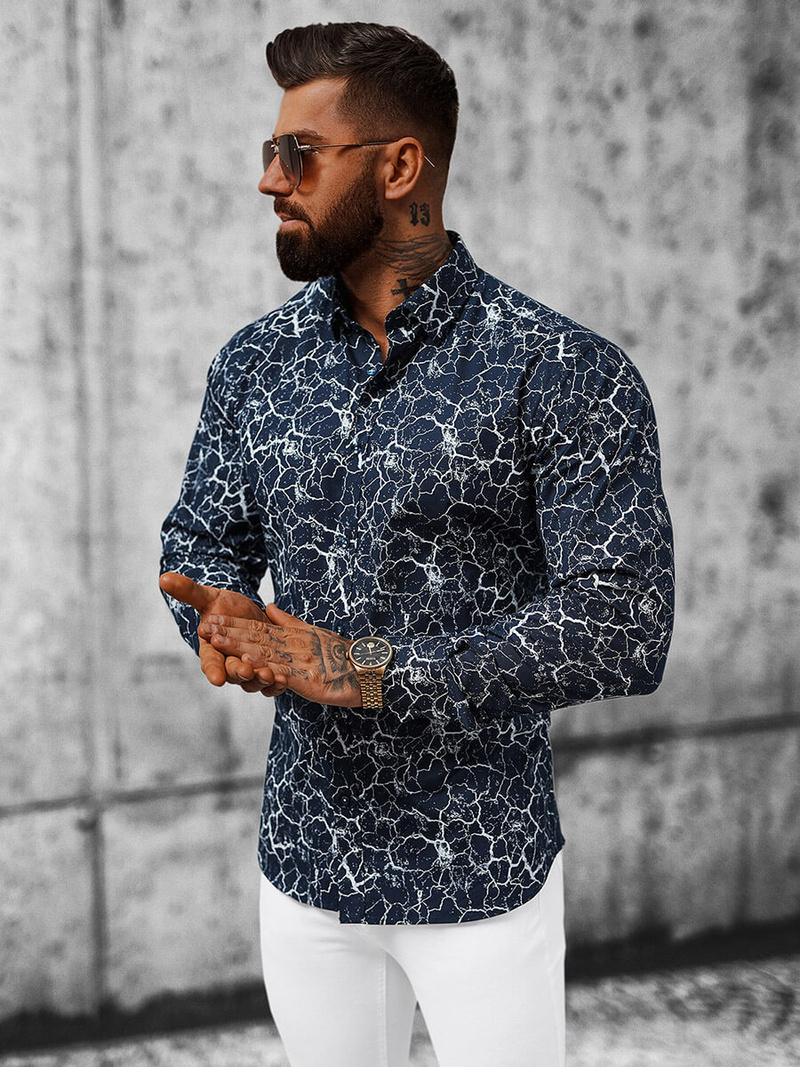 Koszula pochodzi z naszej najnowszej kolekcji. Ma długi rękaw, zapięcie na guziki oraz kołnierzyk typu kent. Zdobi ją modny nadruk nadający jej oryginalnego wyglądu. Koszula została wyprodukowana z wysokiej jakości bawełny z domieszką elastanu, dzięki czemu ładnie dopasowuje się do ciała, nie gniecie się, jest wygodna w noszeniu, miękka i przyjemna w dotyku.