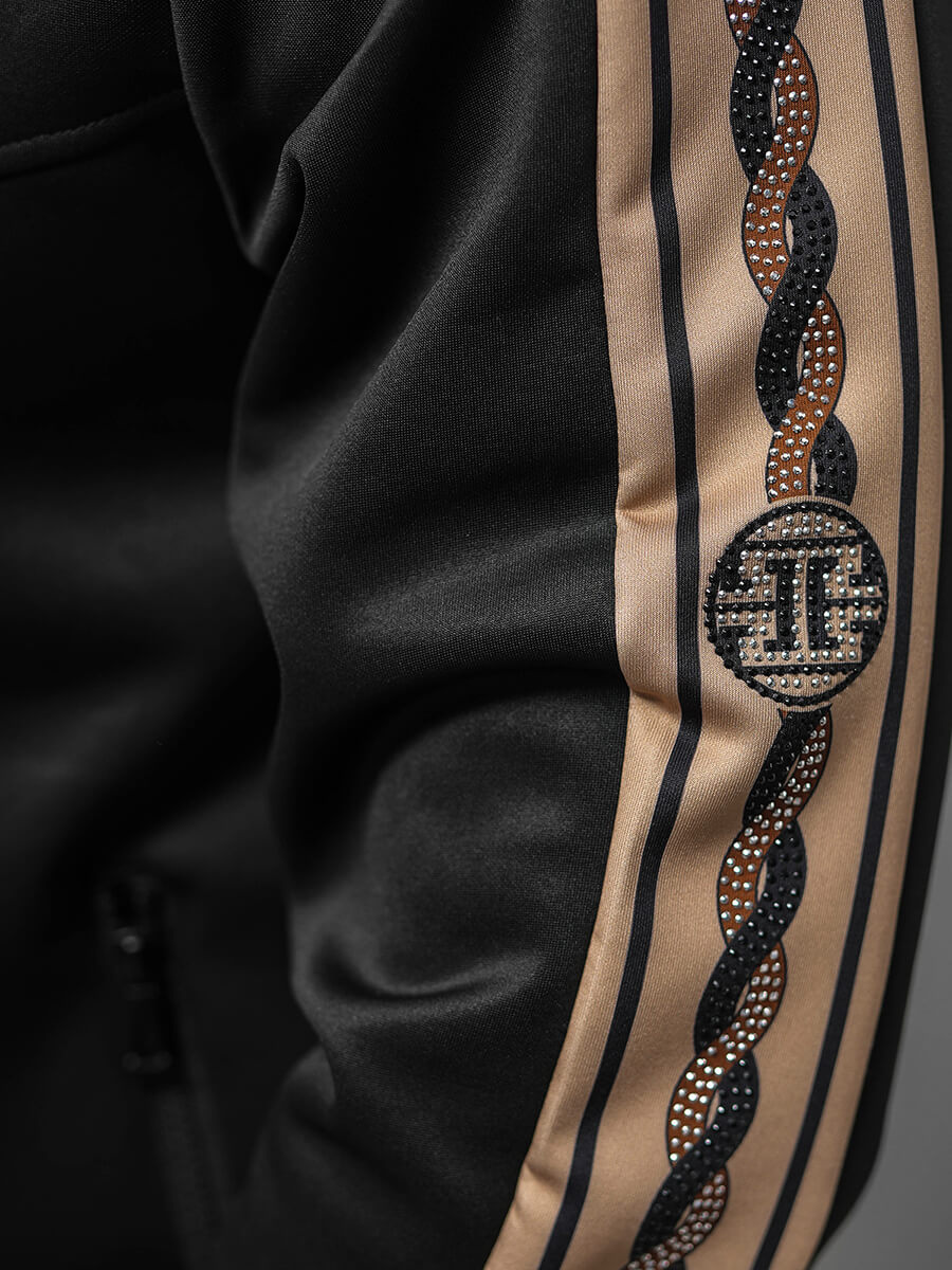 - Spodnie ze ściągaczami, kontrastowymi lamówkami i ozdobnymi cyrkoniami