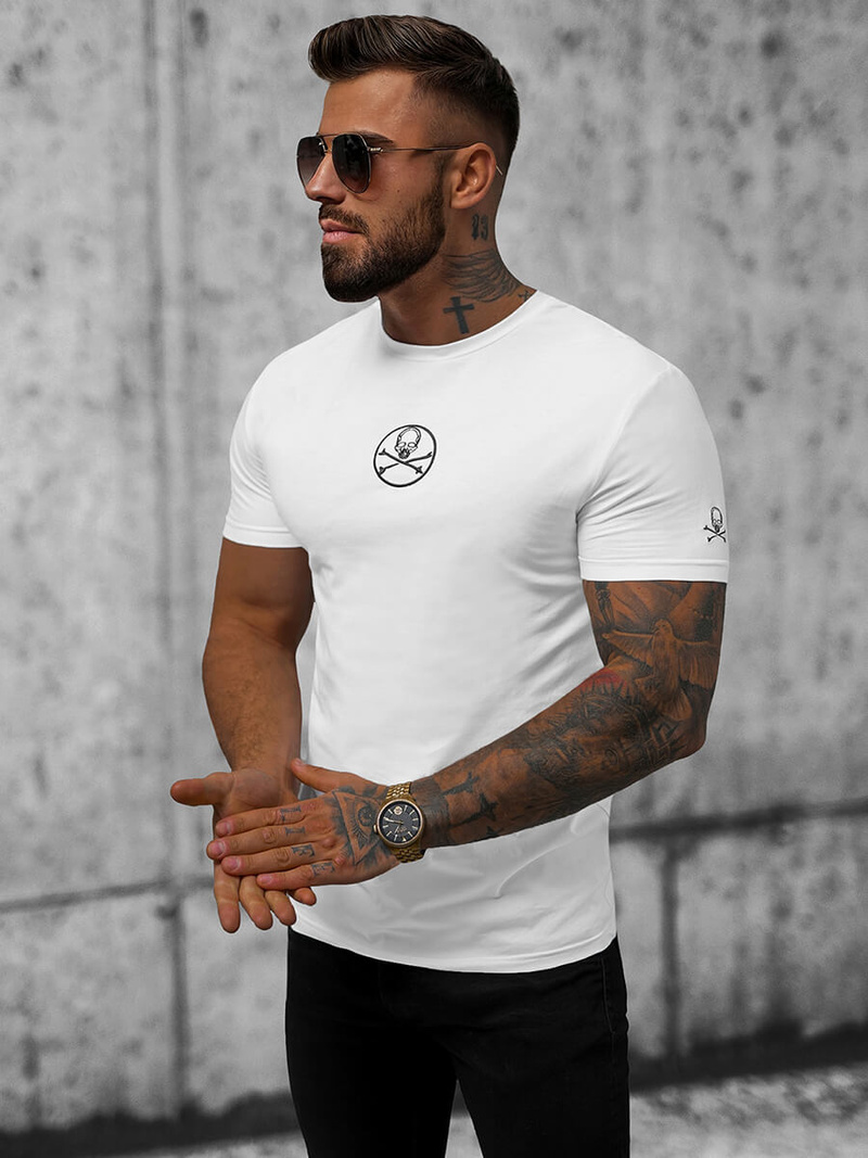 T-shirt pochodzi z nowej kolekcji naszego sklepu internetowego. Ma fason typu slim fit, czyli dopasowujący się do sylwetki. Dzięki wyszywanym grafikom znajdującym się na przodzie oraz rękawach, koszulka prezentuje się bardzo oryginalnie. Została ona wyprodukowana z wysokiej jakości bawełny oraz elastanu. Sprawia to, że jest wygodna w noszeniu, przyjemna w dotyku, nie krępuje ruchów, nie gniecie się i jest odporna na zaplamienia.