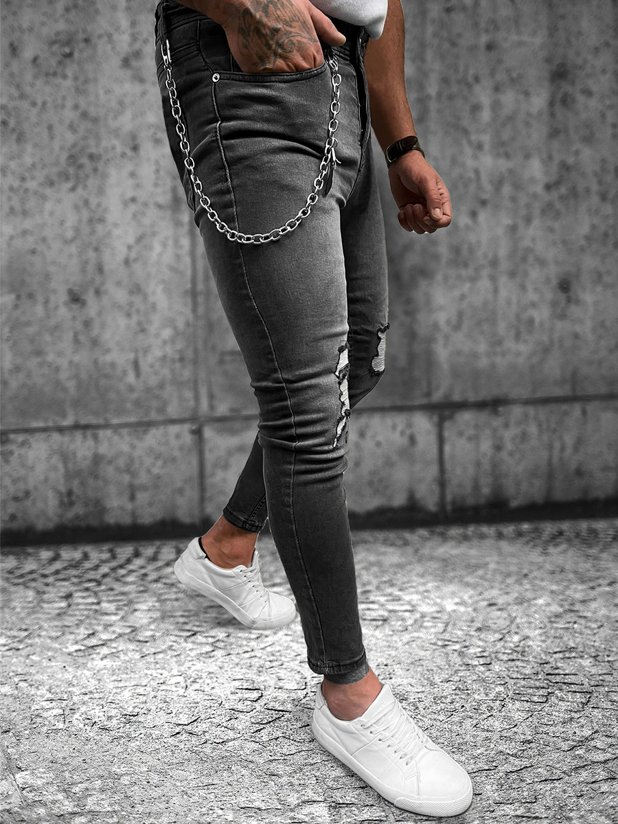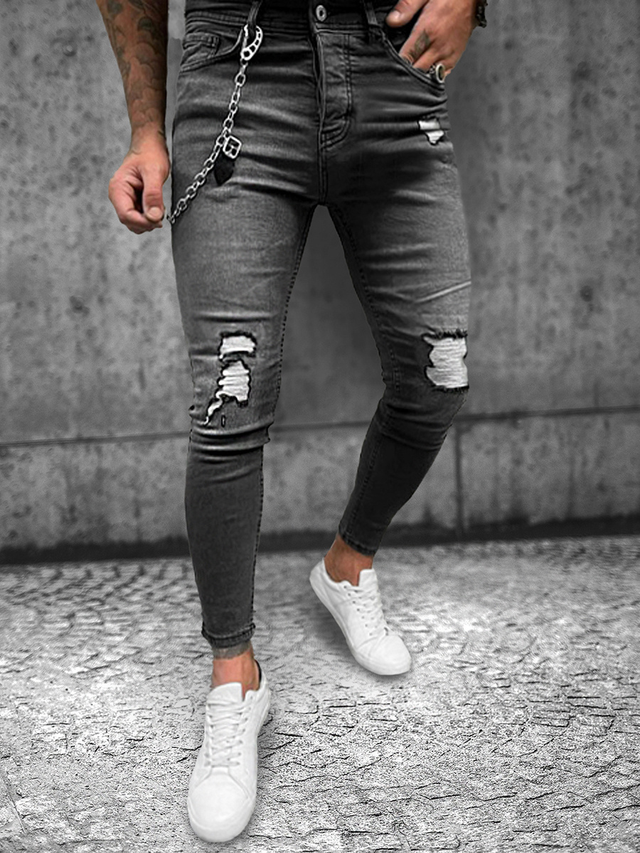 Spodnie mają fason typu slim fit, czyli z wąskimi, dopasowanymi do ciała nogawkami. Z przodu oraz z tyłu znajdują się kieszenie, do których możesz schować klucze, portfel czy telefon. Oryginalnego wyglądu nadają jeansom zdobiące je przetarcia oraz ozdobny, odpinany łańcuch. Spodnie zostały wyprodukowane z bawełny z domieszką elastanu, dzięki czemu są wygodne w noszeniu, przyjemne w dotyku, ładnie układają się na sylwetce, nie gniotą się i są wytrzymałe.